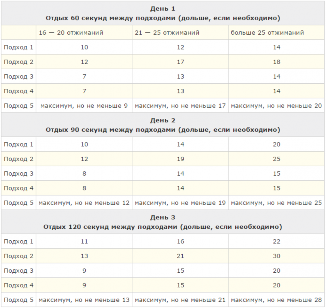 Я решил, что отжимания мне не навредят и нашел программу тренировок на ЗОЖнике. Она на 6 недель, однако я сдал тест и перешёл сразу к третьей недели тренировок, но для удобства буду обозначать их с первого номера. Эта программа рассчитана на 100 отжиманий, и я не надеюсь их выполнить, но хочу улучшить свои показатели.