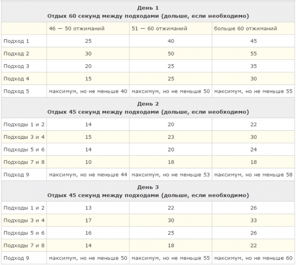 На основе теста я выберу себе столбец и буду заниматься по нему. В конце недели мне предстоит тест на выносливость, и если я смогу сделать 45 или больше отжиманий, то перехожу к следующей неделе, а если нет, то остаюсь на этой.