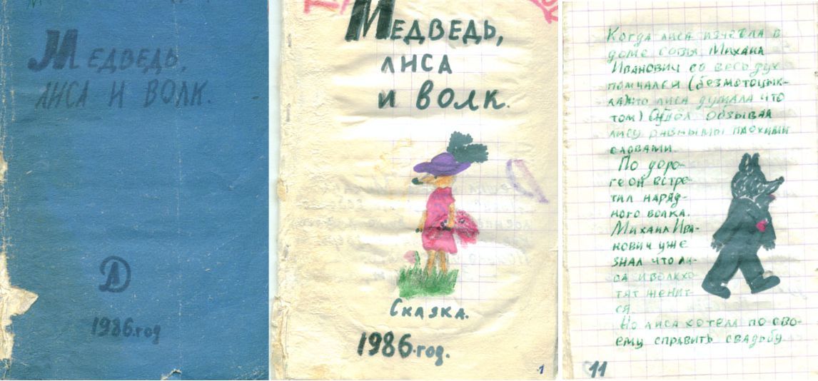 Свою первую сказку-книжку я сделал во втором классе (1986 год), она называлась «Медведь, Лиса и Волк». Книжка представляла собой тетрадку из листов в клетку, вырезанных под один размер и сшитых у корешка. Разумеется, книжка была иллюстрирована автором, то есть мною же. На обложке, конечно же, я нарисовал известный логотип издательства «Детская литература» (буква Л внутри буквы Д). Во времена детства этот логотип красовался на обложках почти всех детских книг, и я, ничтоже сумняшеся, решил, что просто так принято.