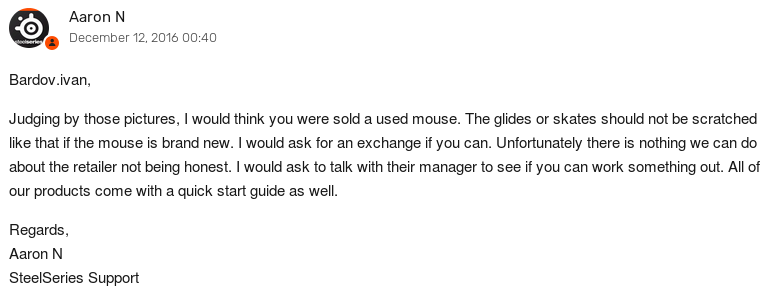 Ответ не заставил себя долго ждать. Сотрудник поддержки Steel Series отметил, что ножки не должны быть поцарапаны, Quick Start Guide присутствует во всех коробках с мышками, и скорее всего, мне была продана бывшая в употреблении мышь.