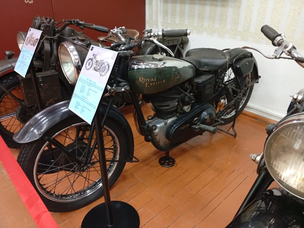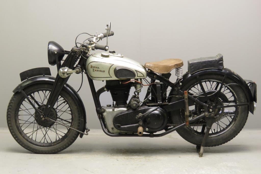 Рядом с Харли расположился чистокровный англичанин Royal Enfield J, аж 1936 года выпуска! Один цилиндр, 480 см³, 20 л.с и 165 кг массы. Стильный мотоцикл, классика. Выглядит моложе своих лет. А еще именно этот мотоцикл участвовал в мотокроссе в Ирбите в 1944 году.