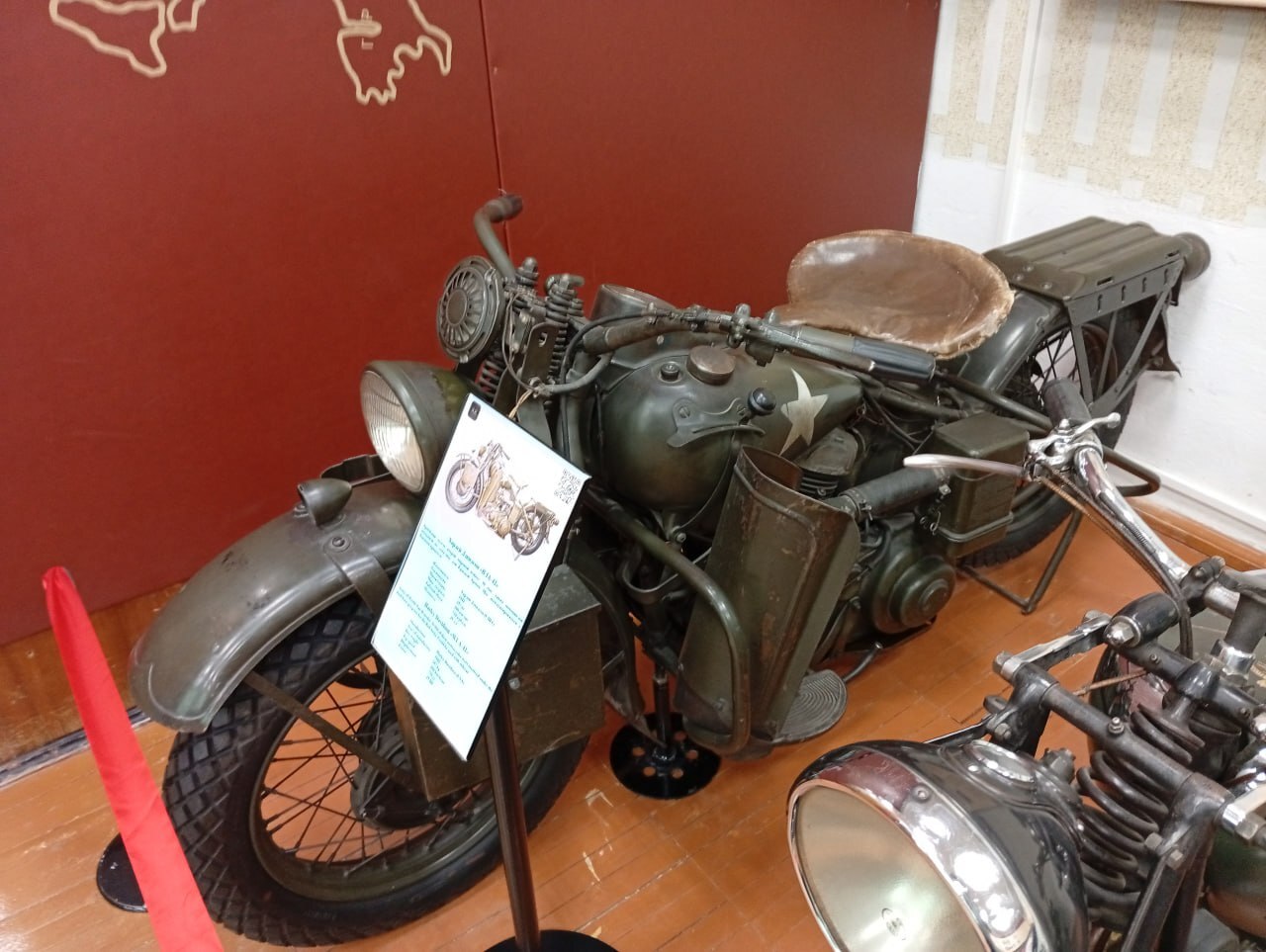 На входе нас встречает армейский Harley-Davidson WLA 42. Очень брутальная штука, большой, кондовый, приятного зеленого цвета.
