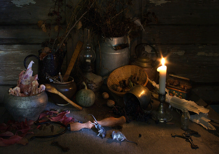 Но пожалуй самый любимый мой натюрморт " В каморке Гингемы". Для него мне потребовались... мыши. Тут мне помогла моя кошка. Мы охотились вдвоём. Я поднимала доски в старой голубятне, оттуда выскакивали мыши, она их ловила и складывала. Я мышей не боюсь, но в руки брать брезгую. Тут ради натюрморта пересилила себя. Вот он, этот "шедевр"))
