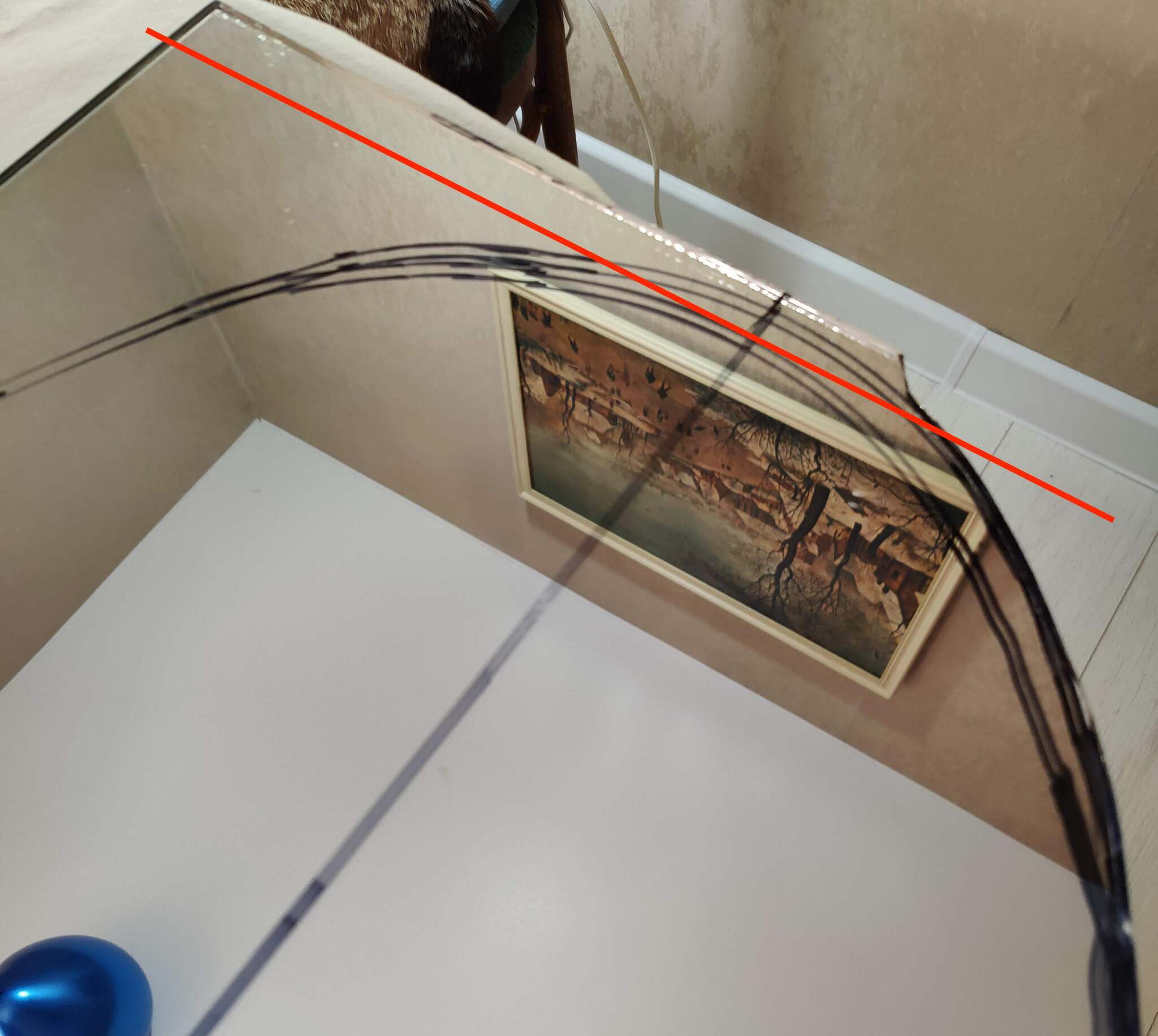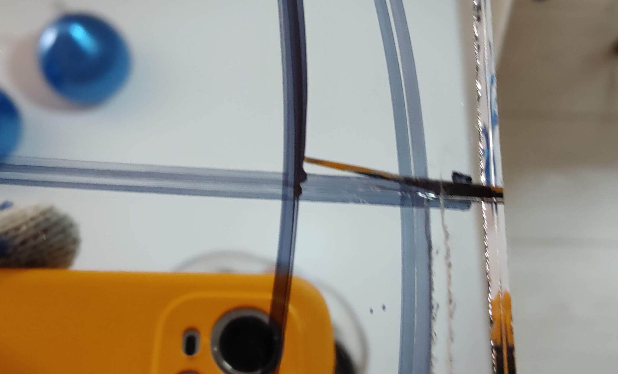 Первым делом рисуем новые линии реза и срезаем полосу стекла так, чтоб отрезать стрелку полностью. Отдельного фото не сделал, но наметил рез на фото красной линией. Переотражений на фото много, но можно увидеть и старый и новый контруры.
