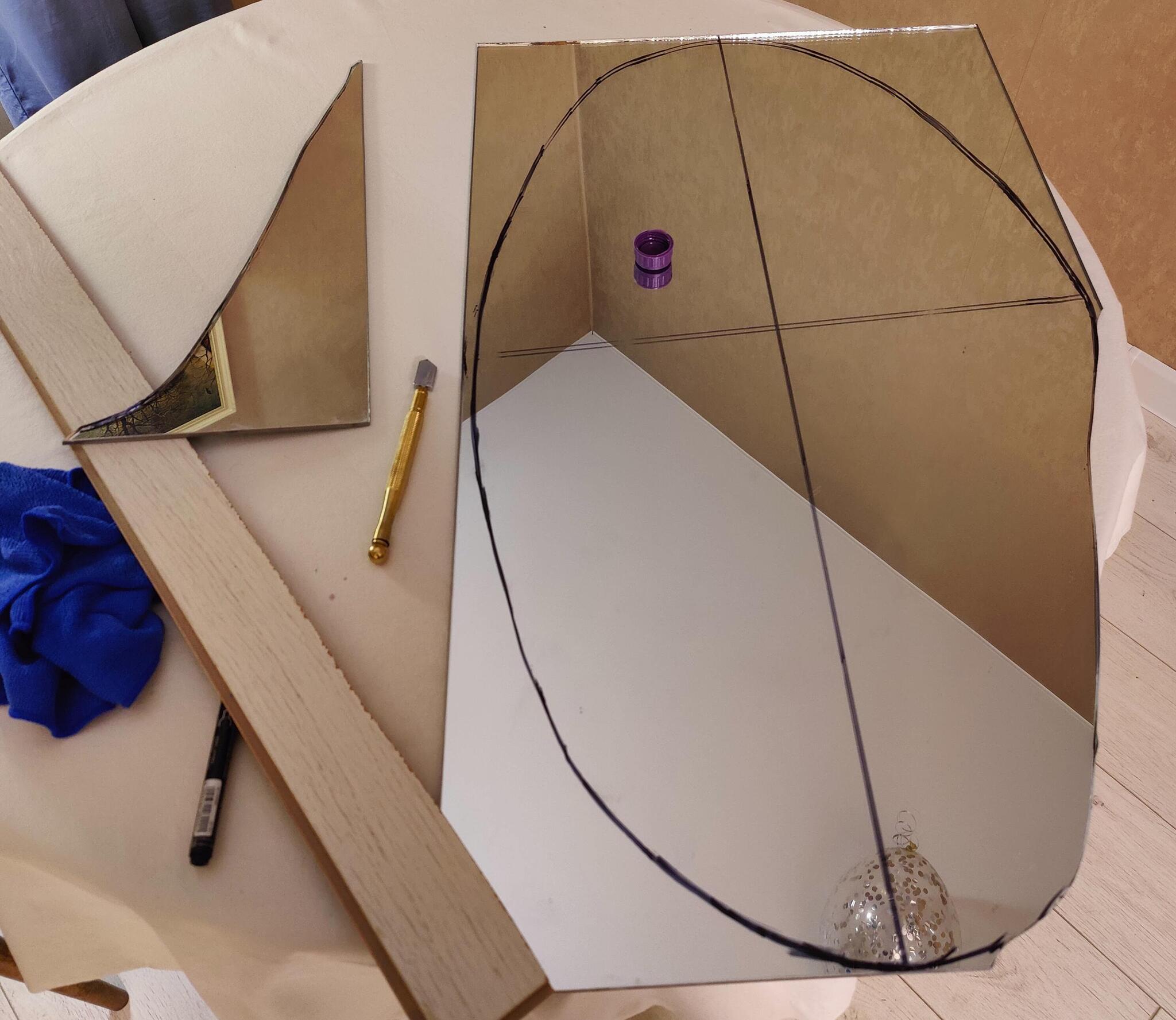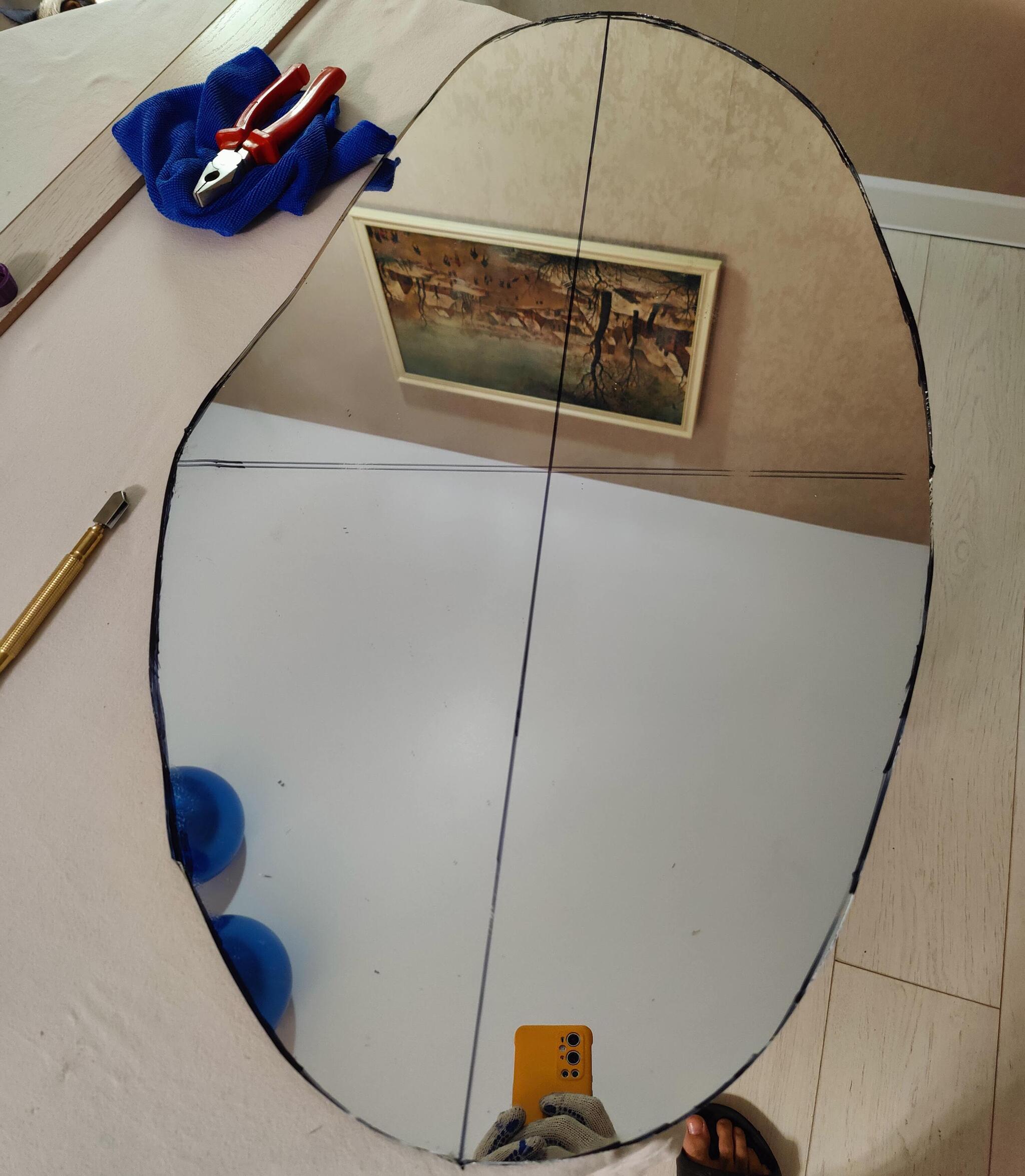 На этом пока всё и так получилось много. Итоговые размеры зеркала после шлифовки краев (будет в следующем посте) получились 82х48. Стоит добавить, что не стоит пренебрегать техникой безопасности. Очки и перчатки (словил флешбек после пандемии, чуть не написал "маски и перчатки") обязательно. Перчатки понятно почему, очки нужны потому, что вектор движения стекла, когда вы его сломали, направлен ровно вам в лицо, а от осколка размером в миллиметр никто не застрахован. Осколков вообще по итогу получилось много и крупных, и мелких, хотя мы ничего не разбили. Так что тщательно продумайте место, где вы будете резать и как вы его потом будете убирать. Резать на диване явно плохая идея, стол накрытый плотной тканью лучший вариант.