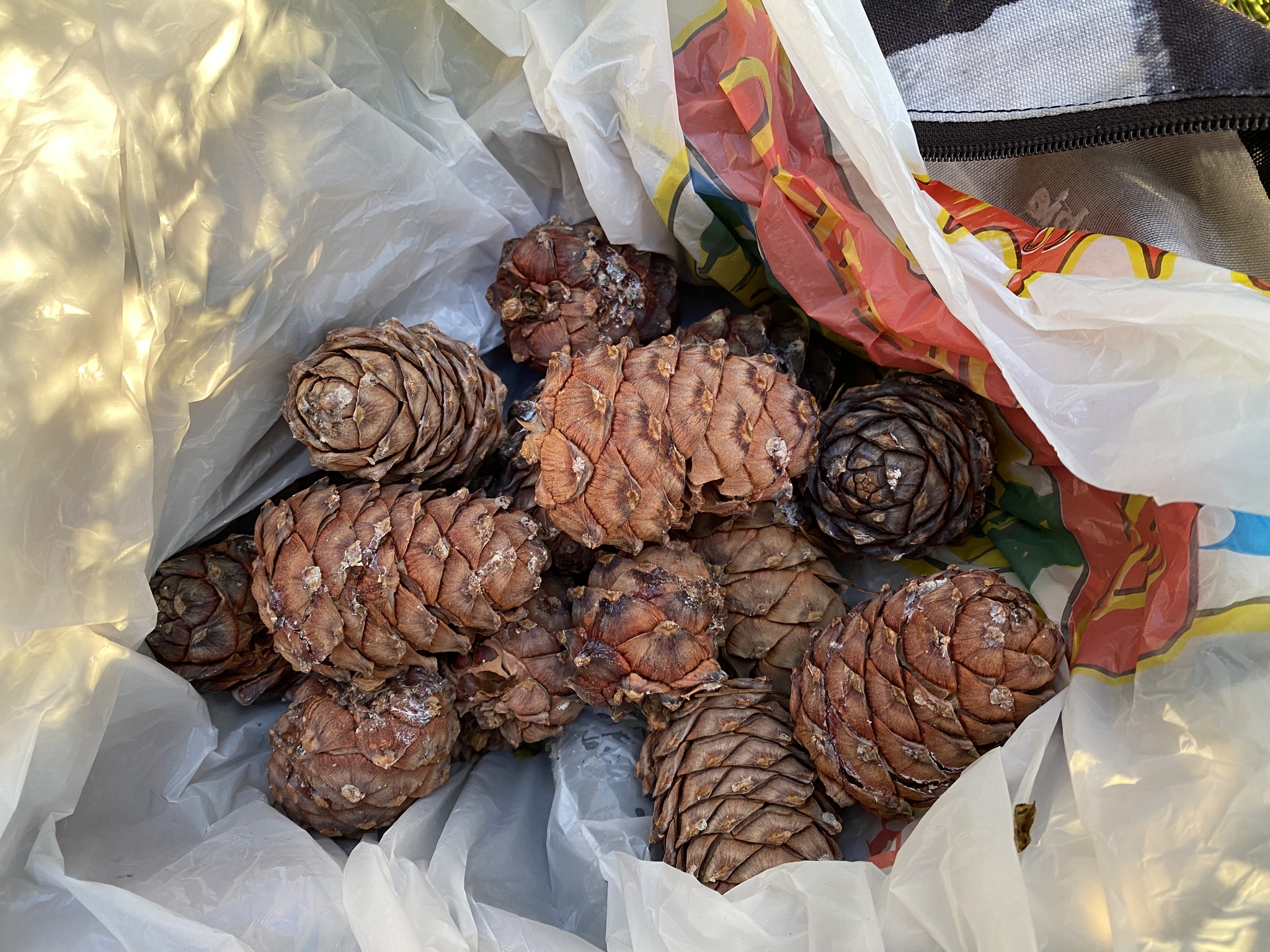 В итоге набрал шишек и наелся чернички, а грибов я больше так и не видел. Это все потому, что взял нож. Орехи свежие очень вкусные.