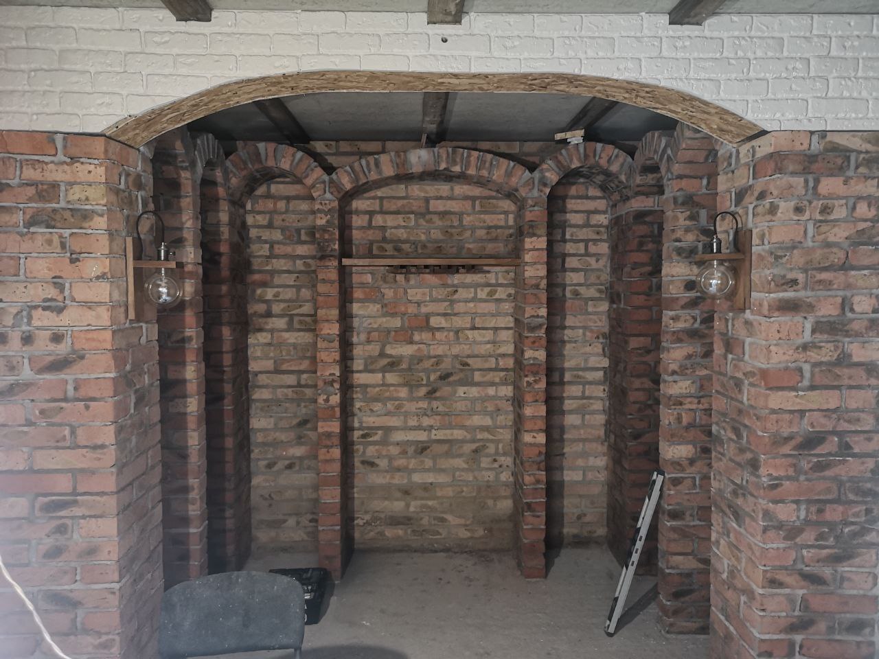 Когда была закончена половина кирпичной кладки мне пришлось остановить ребят, так как, первое: банально кончились деньги, второе: мне показалось что таким количеством колонн я съедаю очень много пространства. Лучше будет заменить две колонны (слева и справа от входа) на деревянные серванты и ещё что то.
