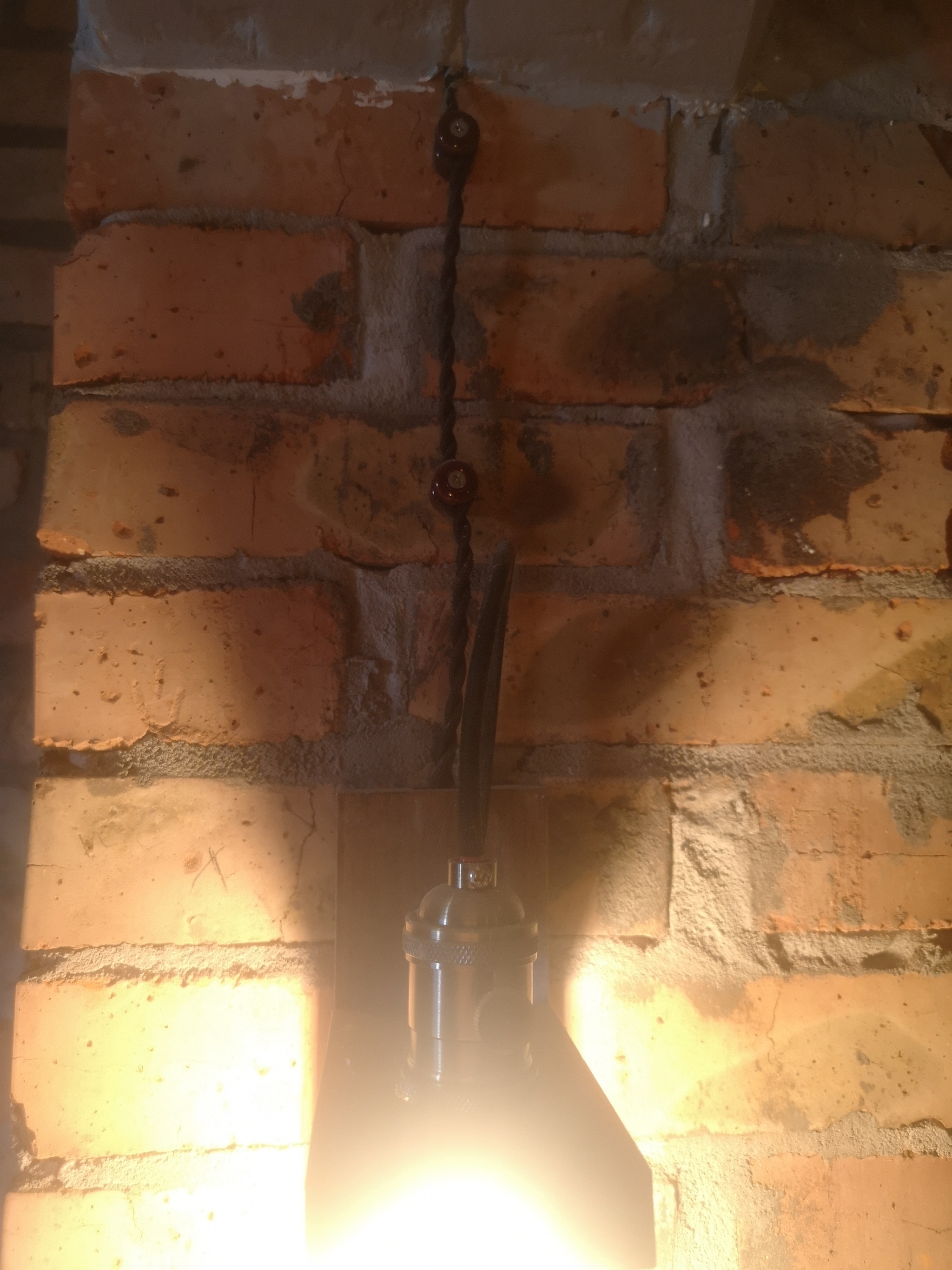 Пока я игрался с выкладыванием арки из кирпичиков, пришёл электрик и сделал разводку проводки. Проводку делал тоже под винтаж: плетёные кабеля в тканевой оплетке, керамические пенёчки для крепления кабелей, керамические розетки и выключатели. Все некрасивое будет спрятано внутри центральной балки.