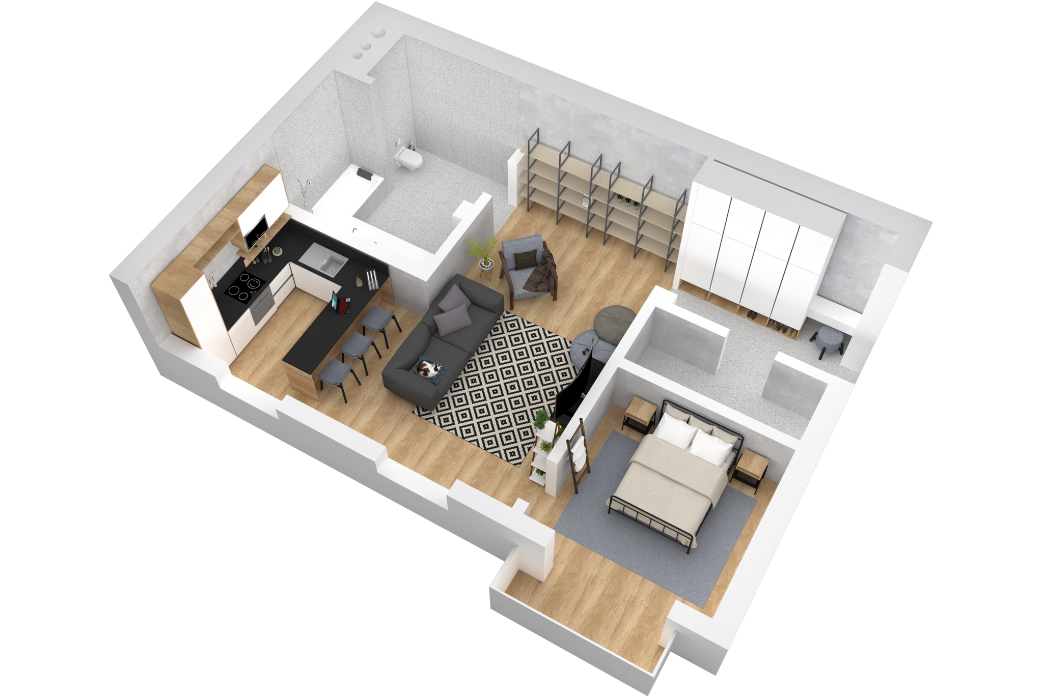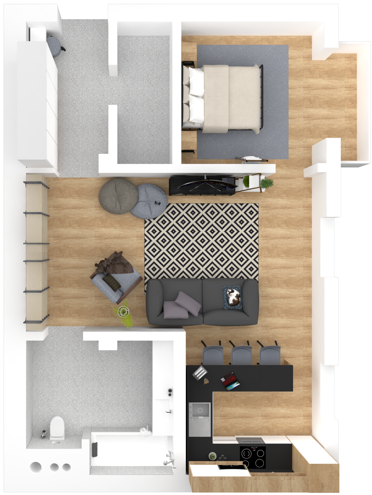 Начала с обмерочного плана. Потом - план демонтажа и монтажа стен. Расстановка мебели, розетки и выключатели, лампочки и люстры, сейчас отрисовываю кухонный гарнитур. А ещё нужно сделать раскладку напольного покрытия и плитки, подводку сантехники.