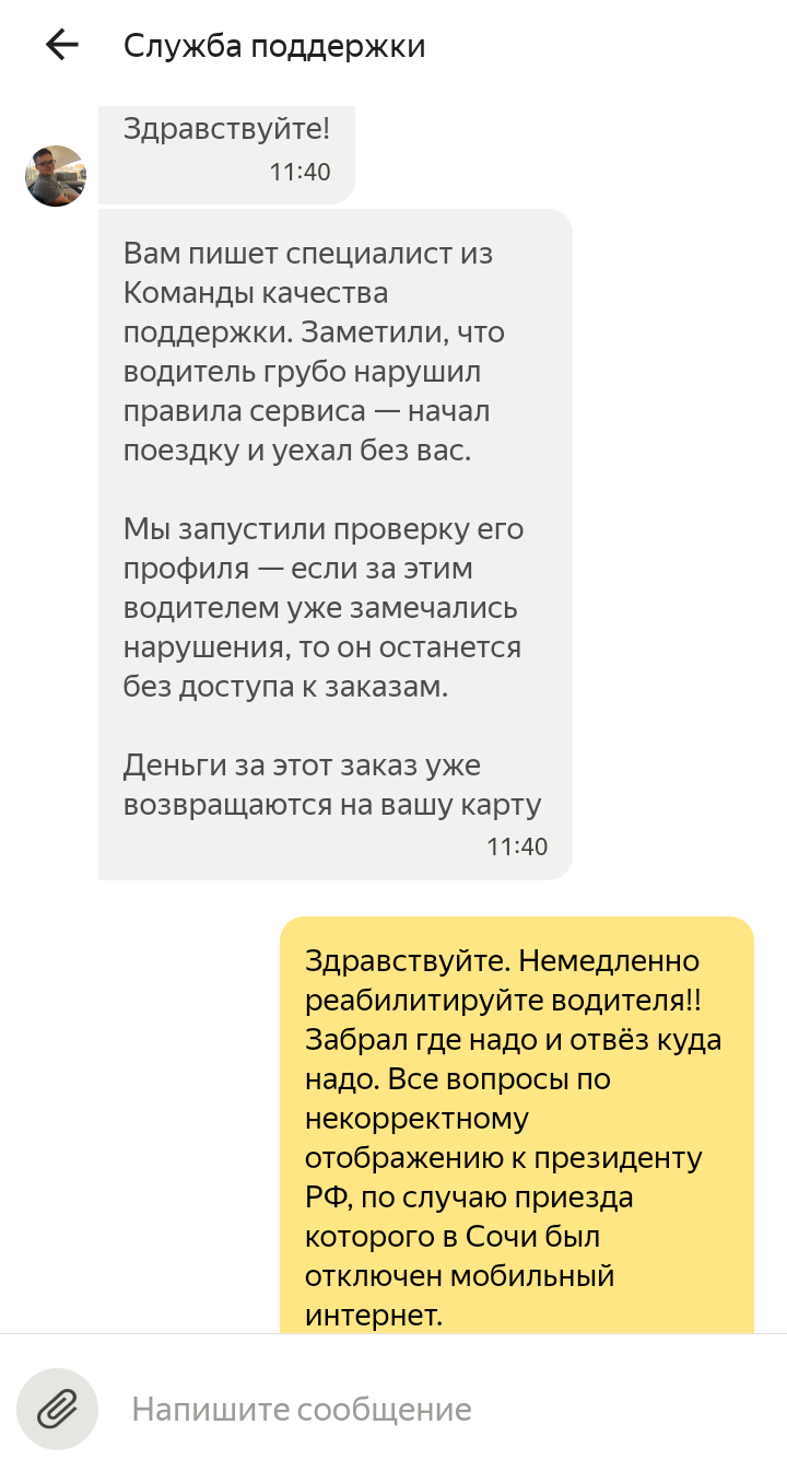 Значит заставила меня жизнь вчера 07.06.23 воспользоваться такси в Сочи с целью попасть в аэропорт. Был я там на отдыхе, за новостями не следил, поэтому не знал что в этих числах там форум будет проводиться с участием наших первых лиц и самого первого лица тоже. Так что когда часов в 10 утра у меня исчез мобильный интернет не придал значения, подумал какая-то локальная проблема, вышку дождем смыло или типа того. Подключился к отельному вайфаю и давай такси себе вызывать. Приложение искало машину минут пять точно, но для Хосты это нормально как я понял. Нашлась в Мацесте, подача 15 минут. Ну и норм, запас времени у меня был. Когда счётчик минут начал таять а машина так и стояла в Мацесте стал догадываться, что проблема с интернетом не такая уж и локальная... В итоге созвонился с водилой, он был уже почти на точке, без проблем сел и поехали мы в аэропорт. Уже от него узнал, что по случаю прилёта в Сочи Владимира Владимировича по соображениям безопасности решили заглушить мобильный интернет на денёк-другой. Оба удивились как это нам повезло, что поездка наша вообще смогла состоятся. Довёз он меня как надо, вручил чемодан из багажника, пожелал приятного полёта, все такое... Пока проходил контроль было не до телефона, даже акция со снятием обуви в этот день проводилось. А за это время пару смс от банка пришли, о списании средств за поездку и об отмене списании средств за поездку. В одно и то же время! Растерялся. В аэропорту такие-же проблемы с интернетом, но в одной кафешке смог добыть вайфай, лезу в приложение а там...:
