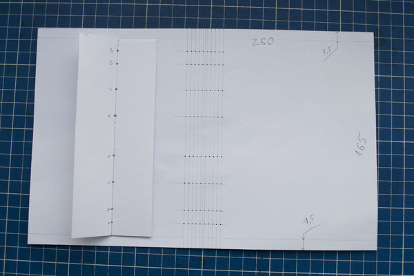 Нам понадобится выкройка. Слева лежит шаблон для пробивания отверстий, как мы помним, его длина = высоте листов. Я сделал обложку с запасом по 7.5мм сверху и снизу. Также, необходимо разметить отверстия на обложке. По вертикали расстояния между отверстиями должны совпадать с расстояниями на шаблоне (при этом важно учитывать запас по 7.5мм сверху и снизу), а по горизонтали 3мм. Один вертикальный ряд это одна тетрадь, значит, нужно сделать 10 рядов.