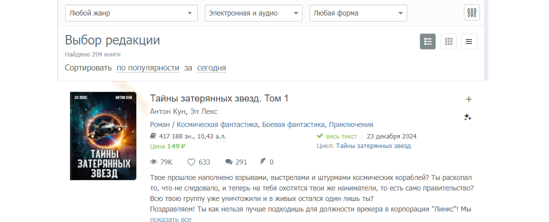 Так вот когда я снял с головы метафорический венок "элитарности" и "нетакойкаквсешности", когда начал просто писать интересные истории, не пытаясь через них навязывать другим свой взгляд на мир, все встало на свои места. Оказалось, что и читателей полным-полно, в том числе и тех, кто готов платить за книги вместо того, чтобы пиратить их, и в топе сайта не "буквосодержащие продукты", а отличные книги, за которые люди готовы отдавать две самых ценных вещи - деньги и время.