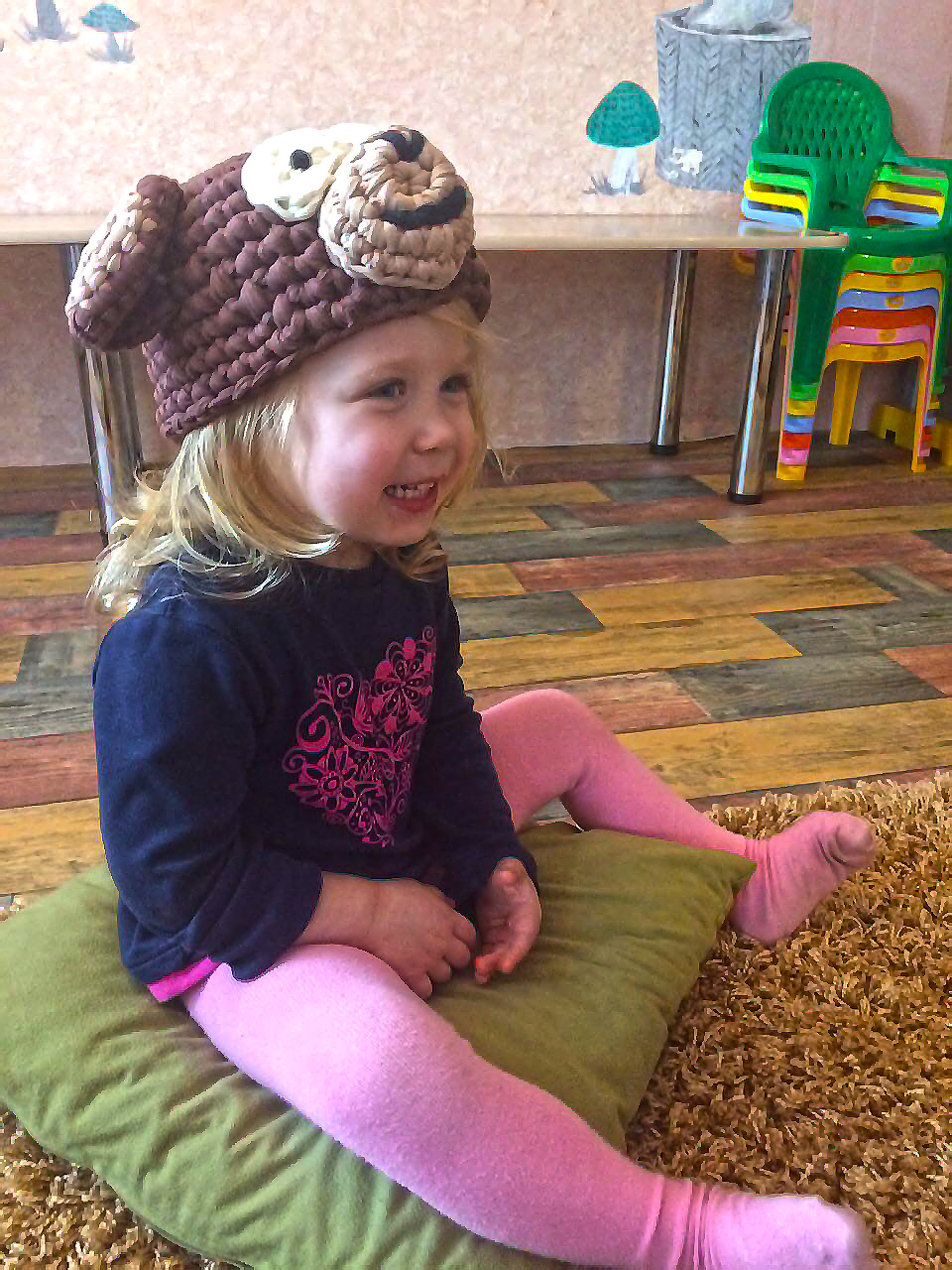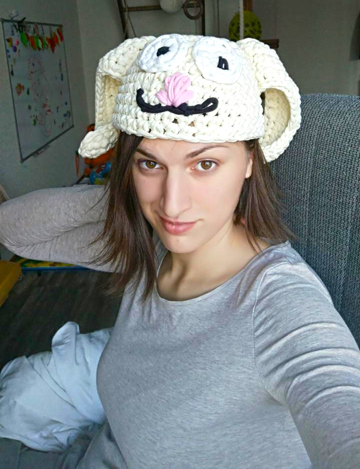 Ну так вот, навязали всяких шапок, шлемов, слоников, лягушек и другой живности. Считай и костюм маскарадный на утренник готов. Единсвтенный минус пока только нашла, эту шапку потом фиг снимешь с клопыша, даже спать в ней теперь ходют.