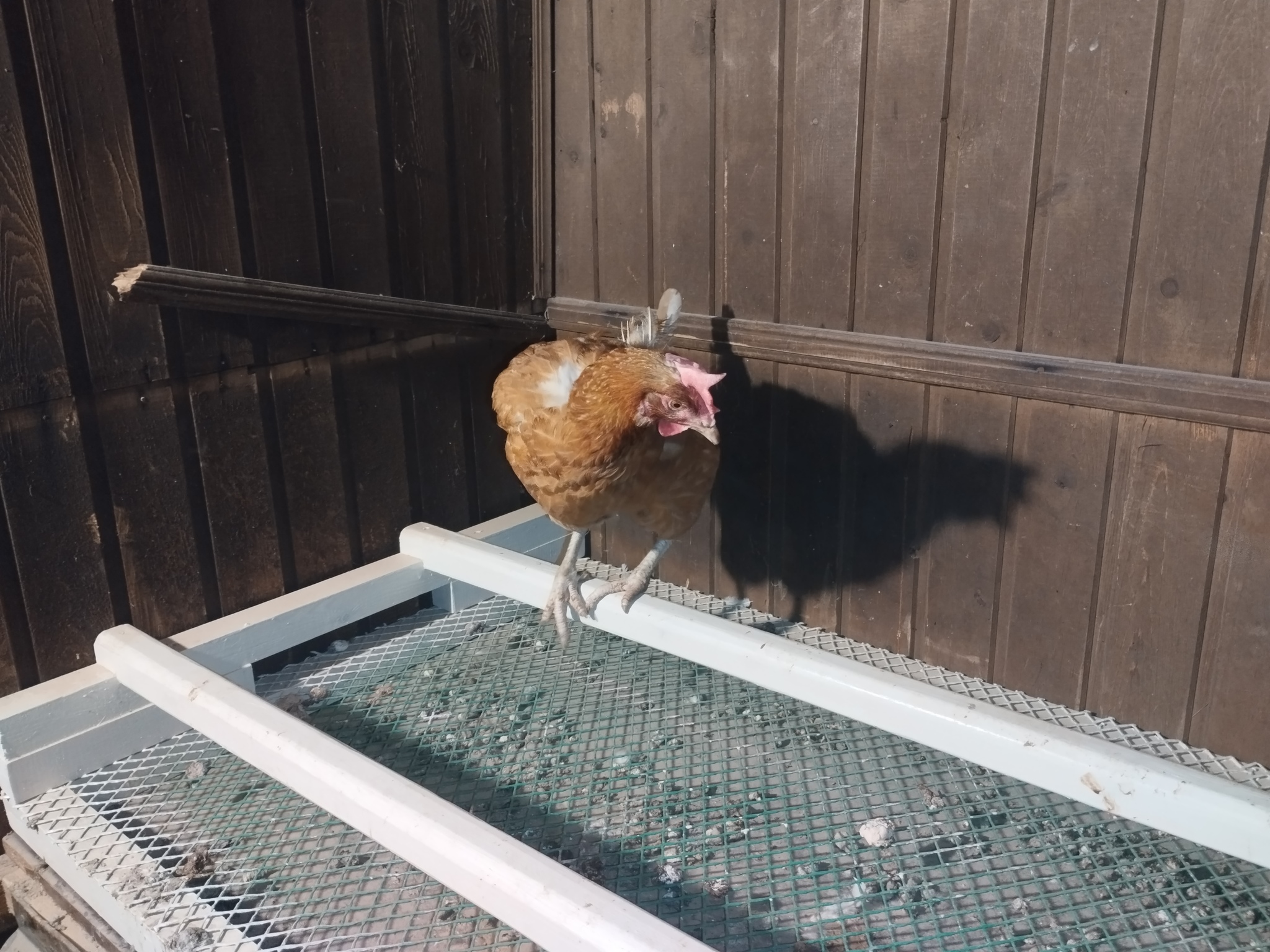 Вот эта курица самая сообразительная. Она сама поднялась на насест сама учится по нему перемещаться и сверху кудахчет призывая к себе подружек которые прячутся в углу.
