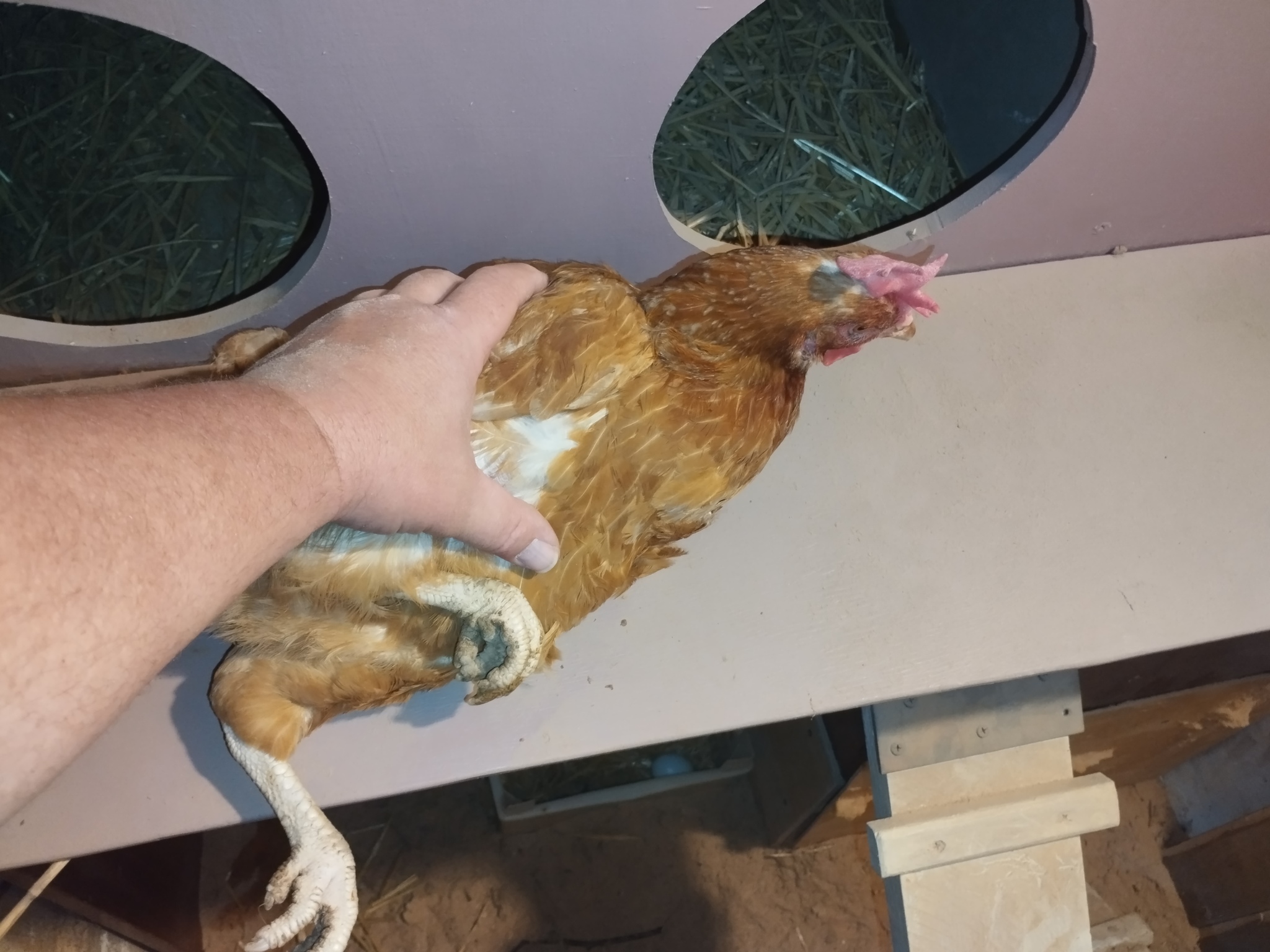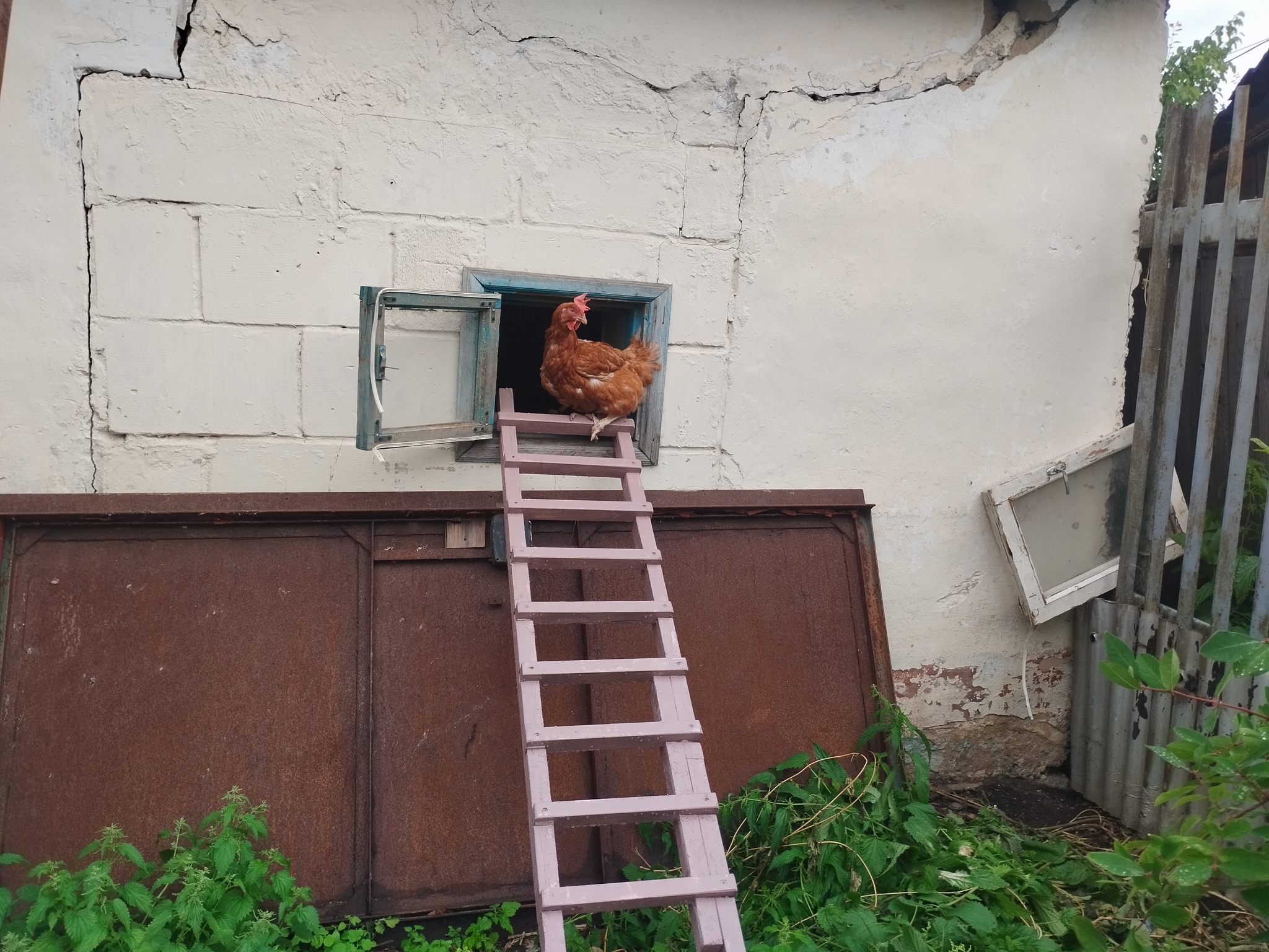 Из курятника есть выход на улицу, но курицы запуганные и не пытаются куда нибудь выйти. Я куриц руками, сажаю на лесенку показывая им путь.