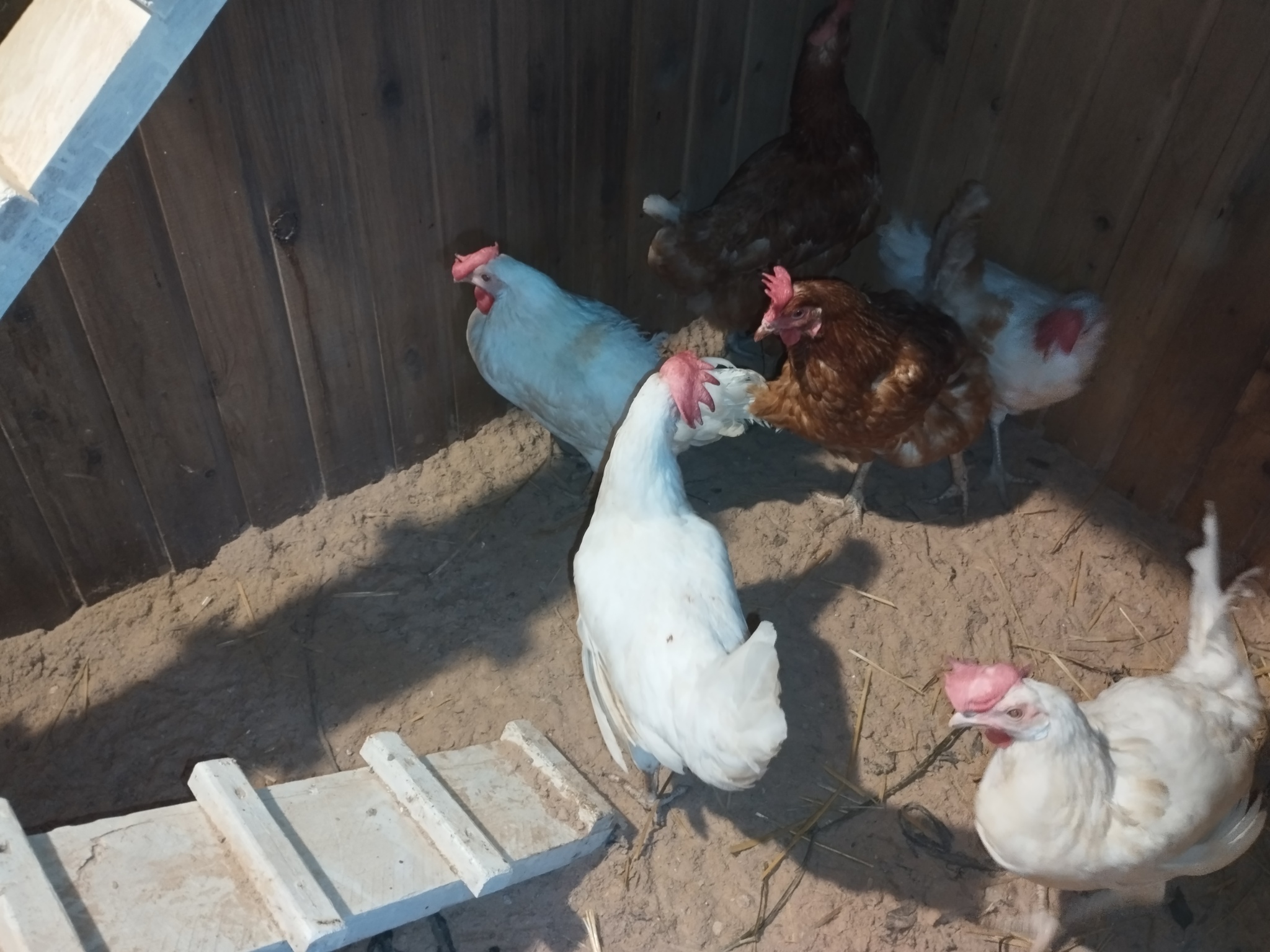 Пришёл вечер, вход для куриц заманчиво светился в сумерках, но курицы его игнорировали и собрались на ночлег сбившись на земле в кучку. Пришлось снова их вручную носить в курятник.