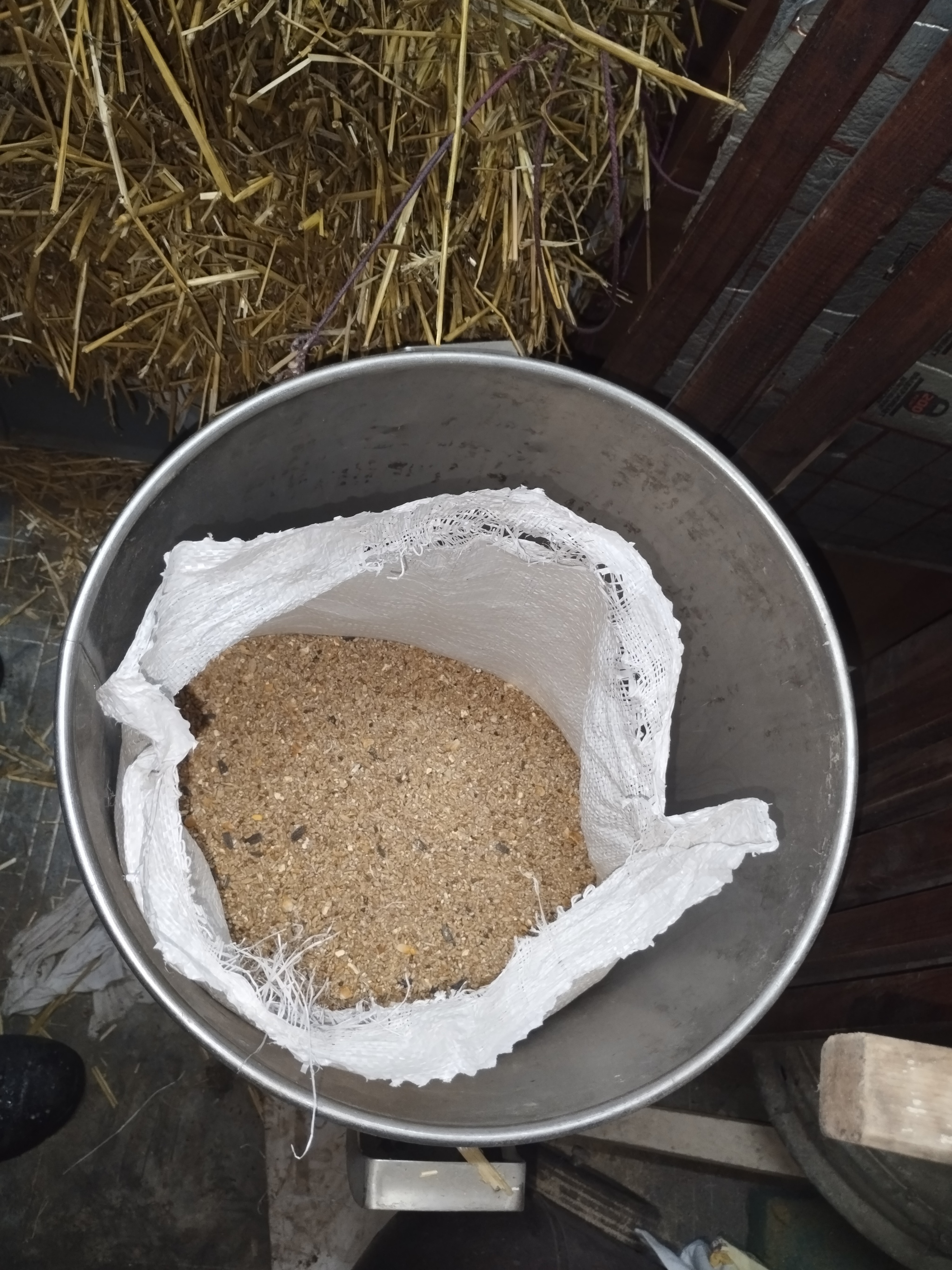 При загрузке кормушки смешиваю эти компоненты 3х1, три части зерносмеси и одну часть комбикорма.
