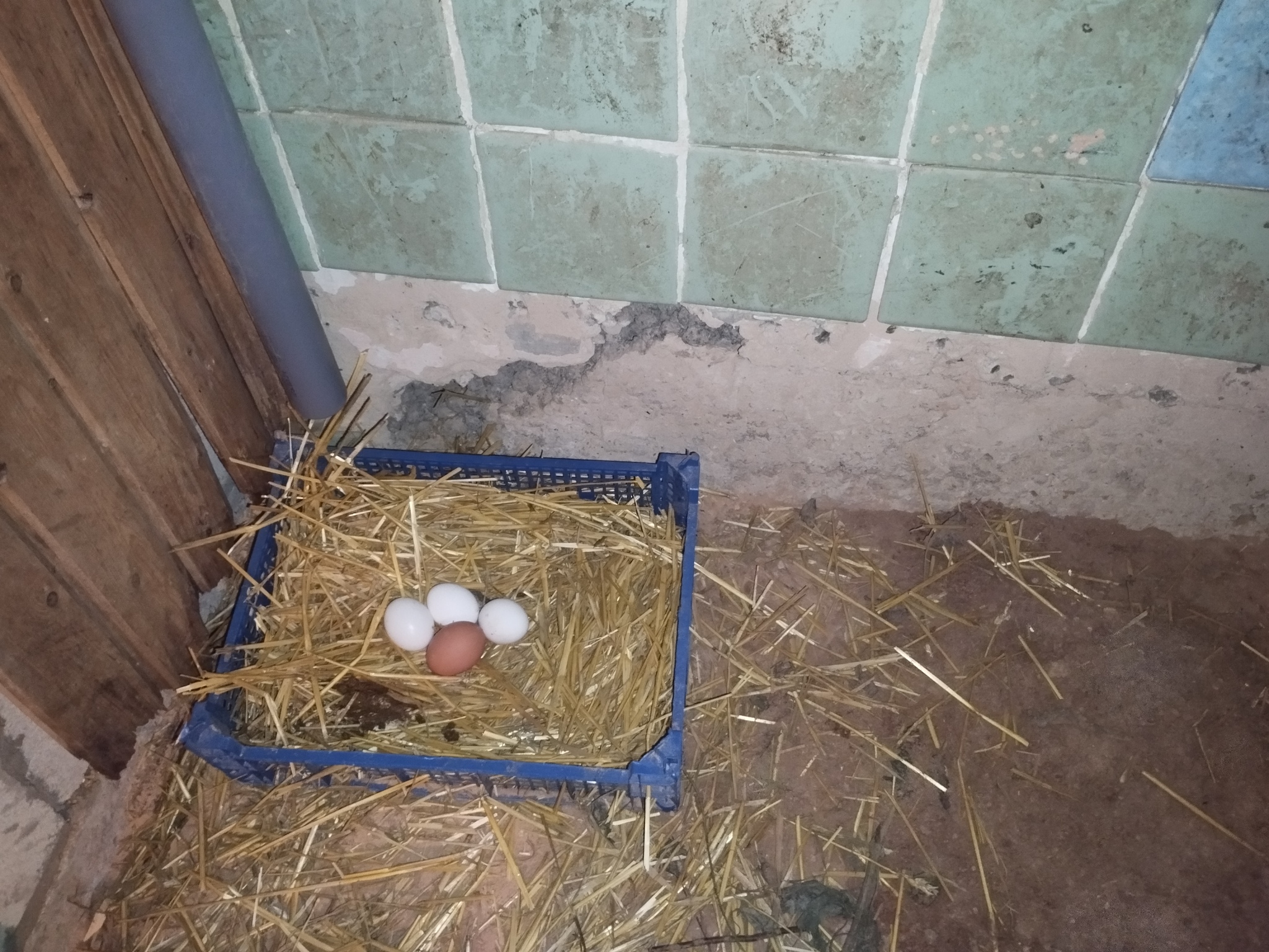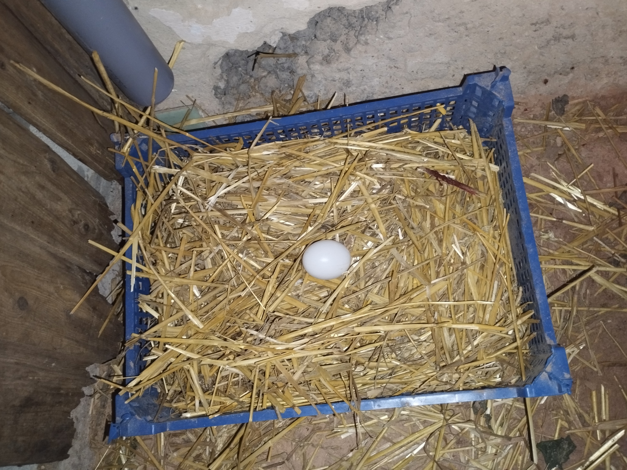 Так как куры не умеют ходить по жёрдочкам и не поднимаются в гнёзда, то нестись они стали просто на пол. Я им приспособил пластиковые контейнеры с соломой и, что бы курочки поняли для чего подложил пластиковые имитаторы куриных яиц. Они продаются в Озоне.