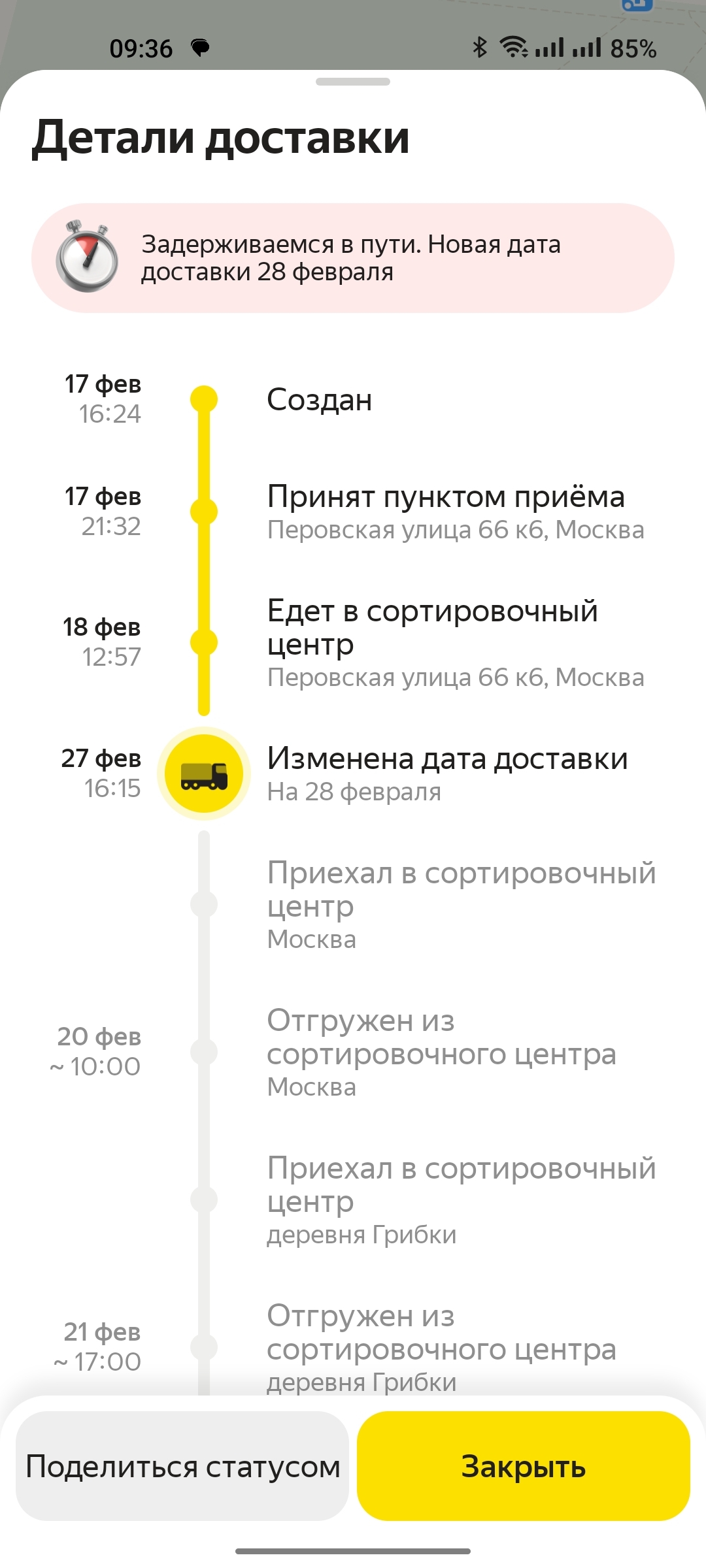 17 февраля 25г продавец, только со второго раза, смог отправить товар, так как Яндекс доставка не могли найти свой же трек-номер, по которому товар должен был поехать ко мне.