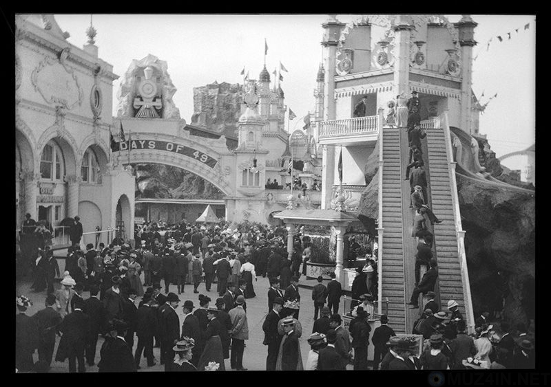 "Luna Park", Кони-Айленд, Юджин Уэмлингер, 1909 год. Механический эскалатор доставлял посетителей на вершину горки Helter Skelter, где работник парка выдавал небольшой коврик, облегчавший скольжение вниз.
