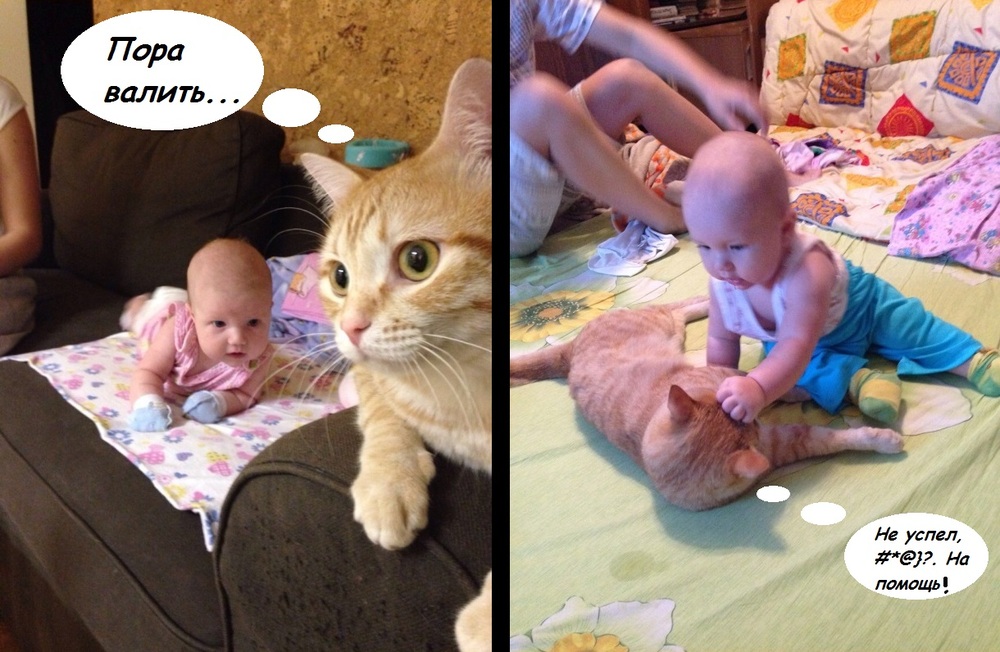 В основном коты (кошки) понимают, что это маленький человек и если обидеть - то большой человек может навалять. Был у меня вообще безбашенный кот, как раз первенец появился, первенец его дергал, но кот не огрызался, предпочитал уйти подальше просто. Потом мы переехали, кота не стало. Но у нас появились два новых кота. Черный такой же безбашенный, рыший - носится вечно и черному покоя не дает, но ни один из них не посмеет тронуть уже двоих детей, даже когда дети на них ложатся или за шерсть дергают, когда пытаются погладить. А вот и они (на обои не смотрите, ремонт был года 3 назад, просто то коты подергают, то дети, устали подклеивать =) ):
