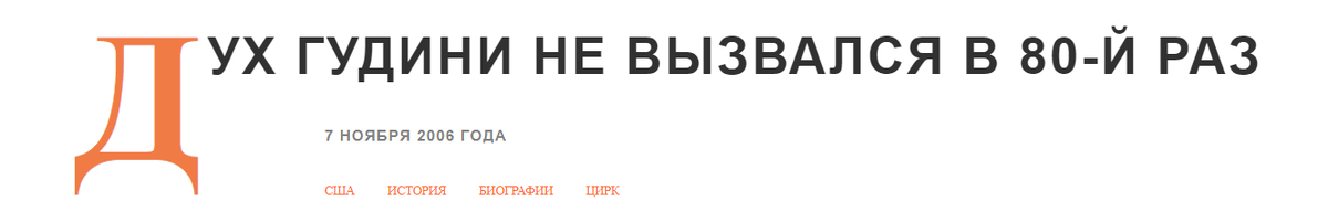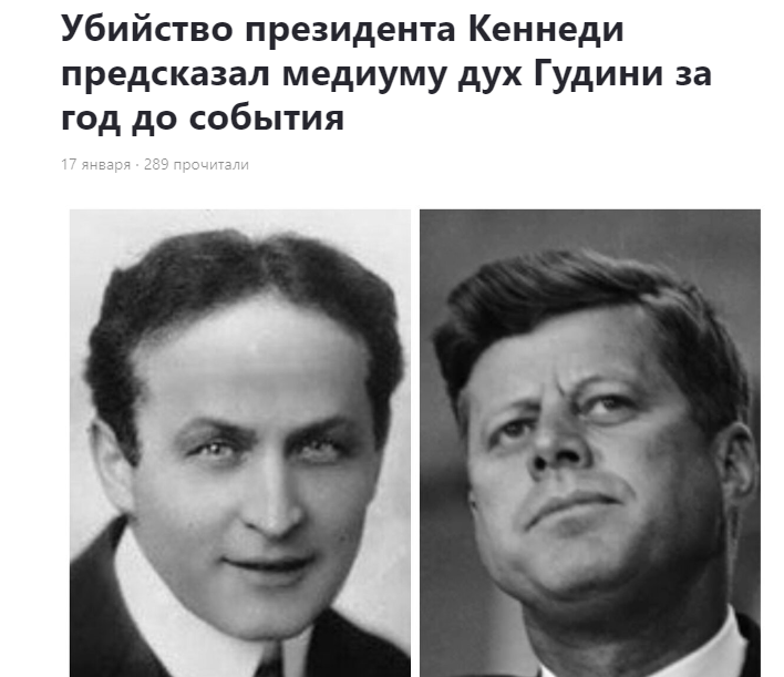 В общем, как я всегда и полагал, совести у таких людей нет, если они даже дух Гудини вызвать собрались, который как раз перестраховался от таких, как они. Дух Гудини и Вторую Мировую предсказал, и убийство Кеннеди, и даже полёт Гагарина в космос, естественно, все материалы выходили уже после свершившихся событий, прям как у наших Ванги или Мессинга.