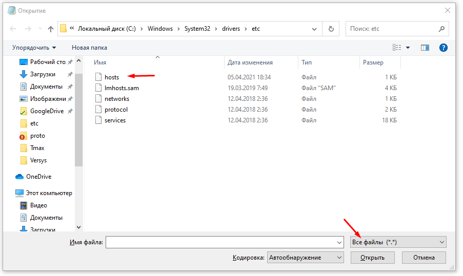 2. Открываем файл hosts: идем в C:\Windows\System32\drivers\etc. В фильтре файлов справа выбираем "Все", открываем hosts