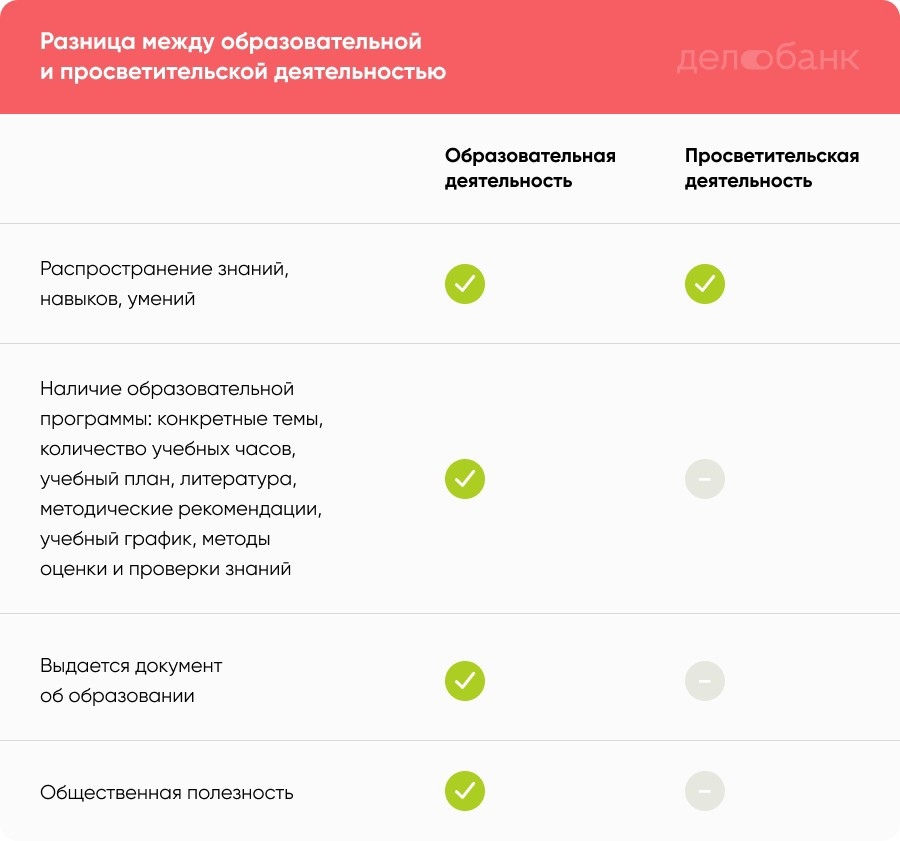 Ключевое отличие: образовательная деятельность основана на образовательной программе. У просветительской деятельности программы нет.