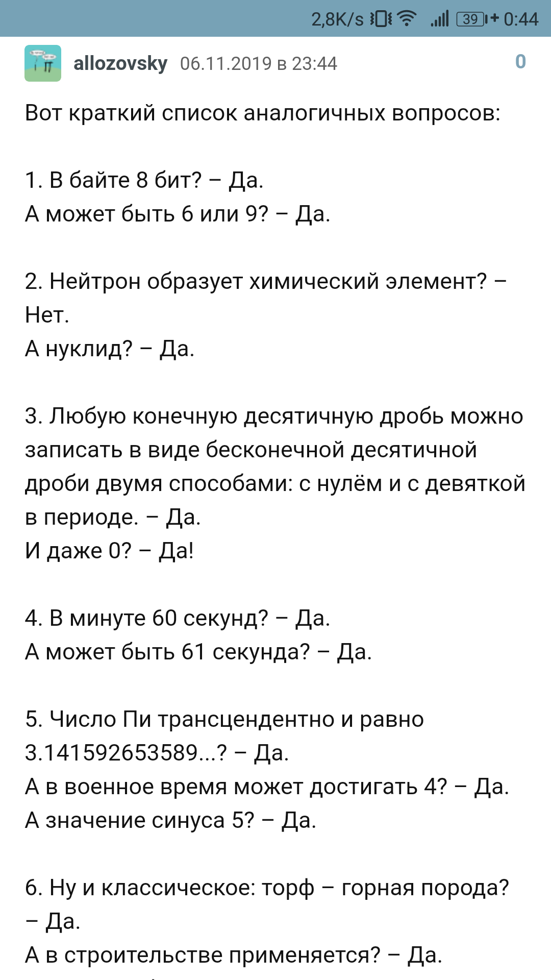 На этом пока всё. Но если вы хотите спросить, является ли 0 натуральным числом, может ли в военное время значение π достигать 4, а синуса – 5, то ответ на все эти вопросы: "Да, если вам так угодно (и вы хорошо понимаете, что именно вы хотите спросить)". Но это уже совсем другая история.