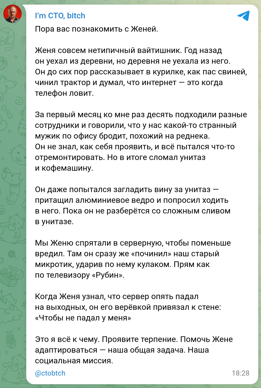 110 imctobitch IT-юмор Как Жека в айти входил Серия I'm CTO, bitch 4 месяца назад 👉️ Прошлый пост про Женю [моё] I`m CTO bitch Женя Офисные истории IT юмор IT Скриншот Юмор Сотрудники Реднек Деревня Адаптация Офис Офисные будни Жека Mikrotik Сервер Мастер Ремонт техники 32 7 2 2 Ещё 0
