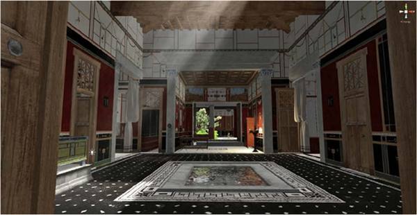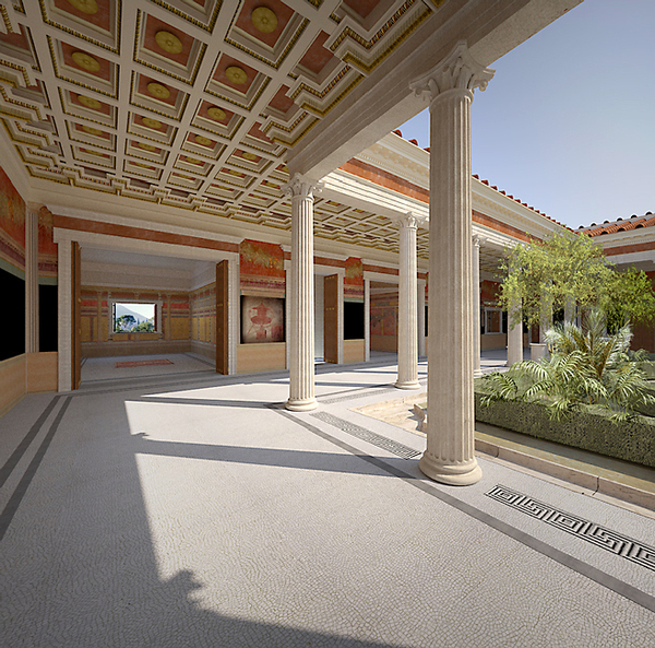 Для создания реконструкции ученые "дорисовали" с помощью компьютерной графики сохранившиеся фрески. Оформление стен - целиком основано на реальной росписи. То же самое касается орнаментам на полу. Во время исследований ученые находили великолепно сохранившийся пол и даже застывшую струю, которая била из крана в саду, когда произошло извержение.