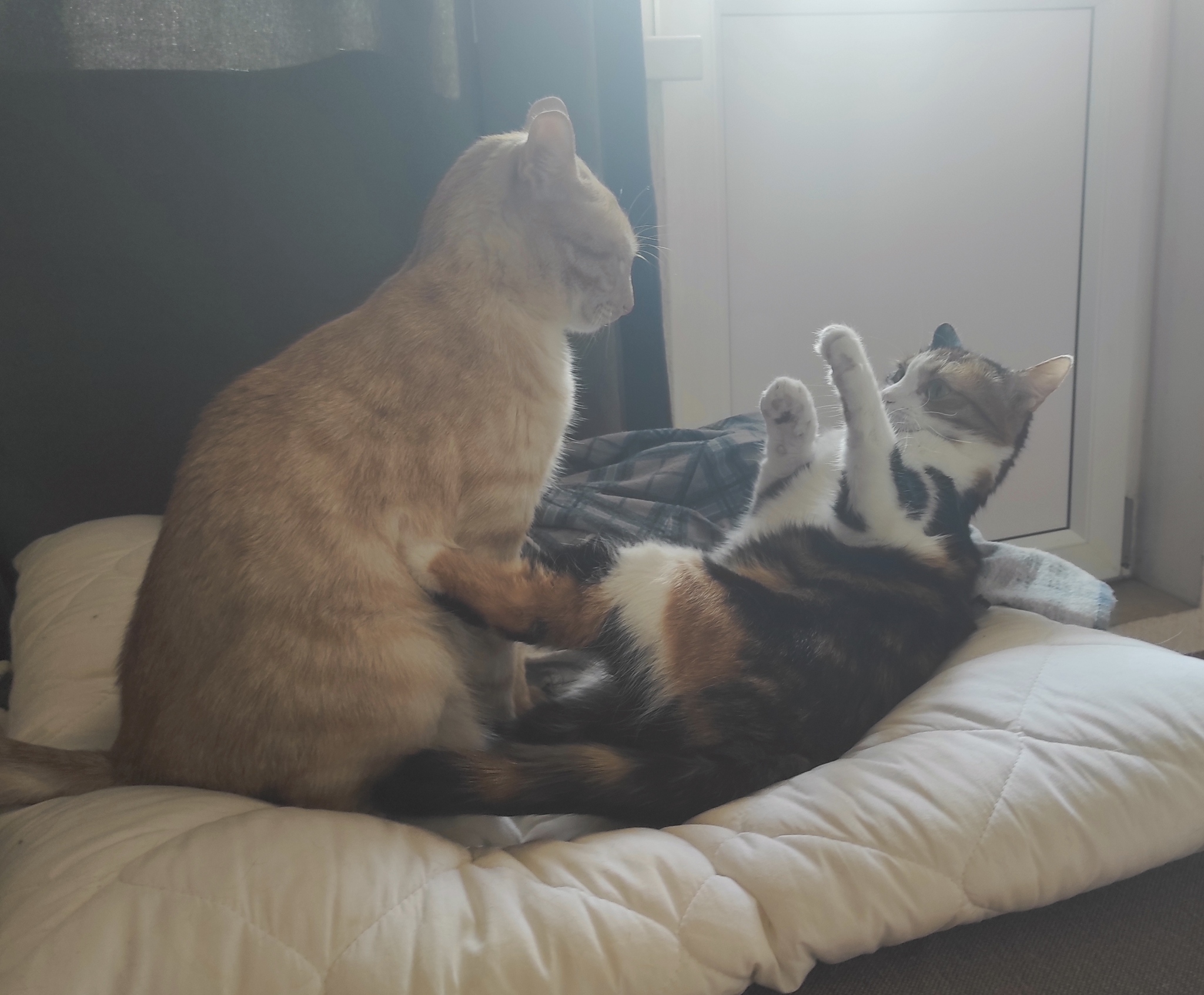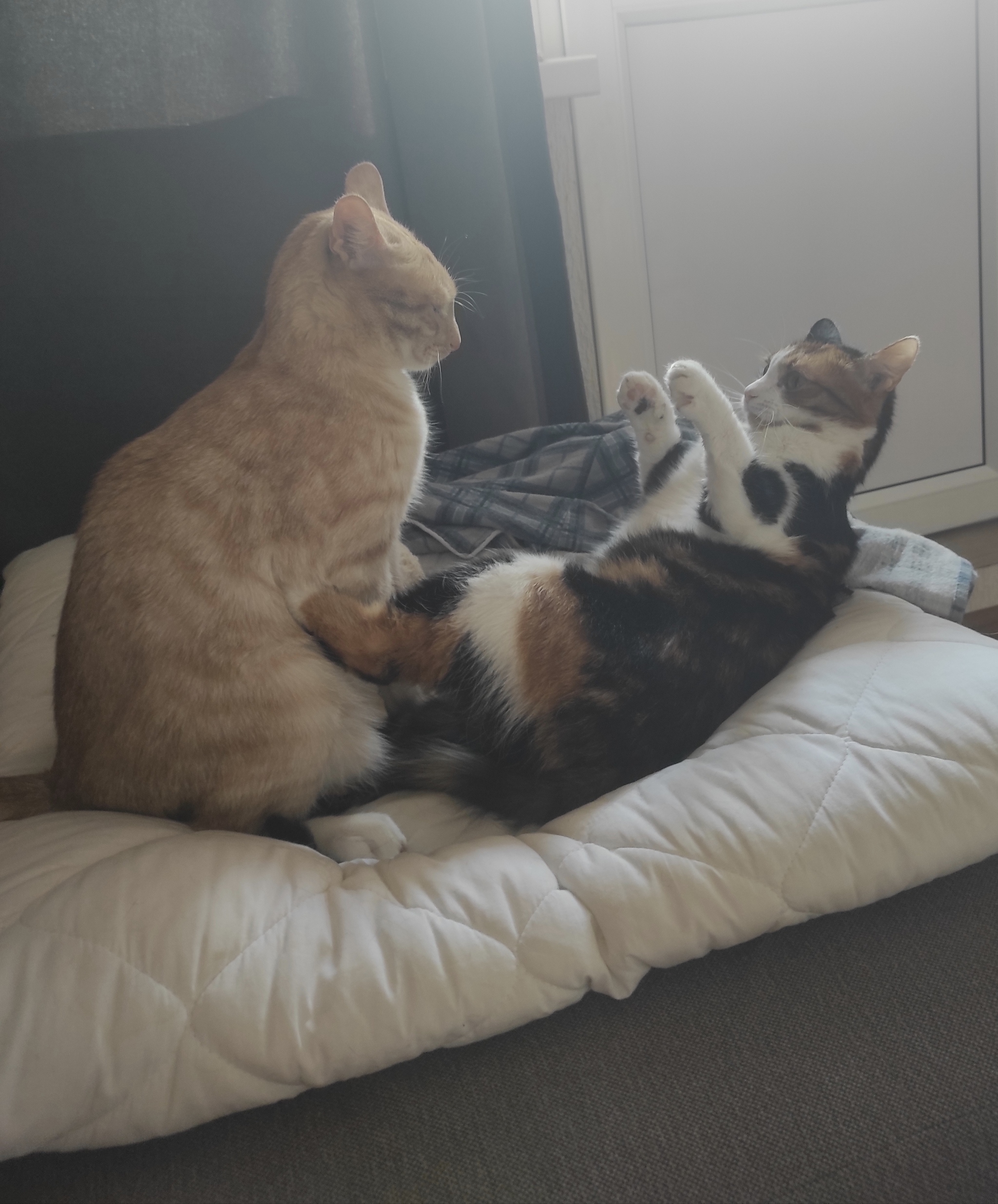 А недавно увидела, что эта мелочь подкрадывается к нему и делает Кусь ему за попу. Затем несётся от него и начинаются догонялки с дракой.