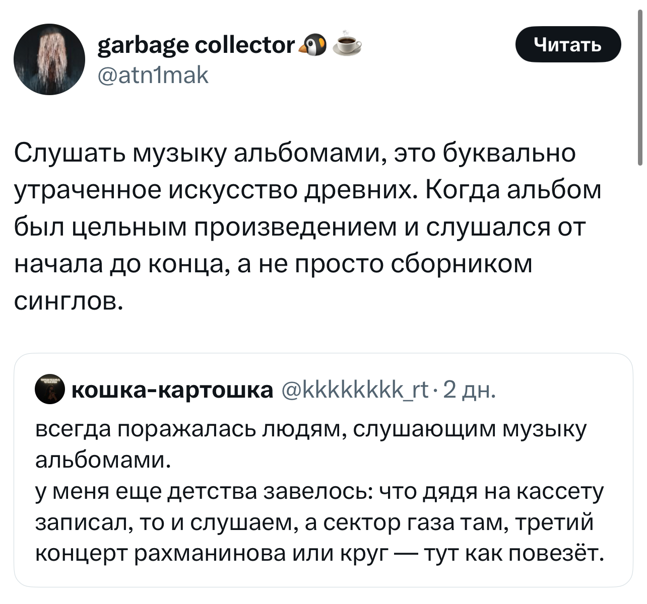 23 v.mixajloff 2 дня назад Смешарики и Ко Серия #ИксТвиттерские Как звучит культурный шок: Круг, Рахманинов и Сектор Газа Юмор X (Twitter) Скриншот Комментарии Музыка Альбом 1 Ещё 0