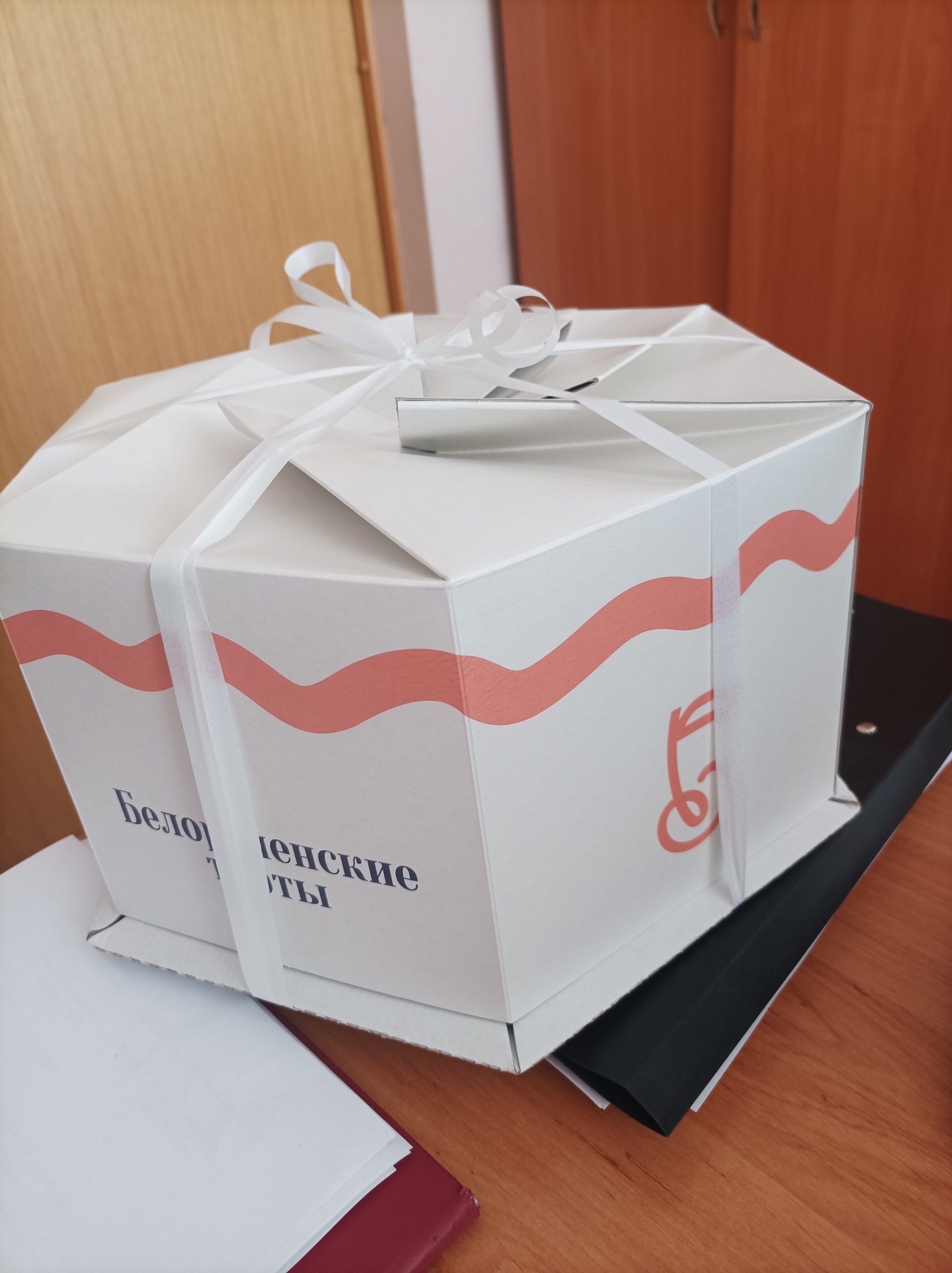 В руках коробка с тортом местной кондитерки, широко известная в узких южных кругах (на фото).