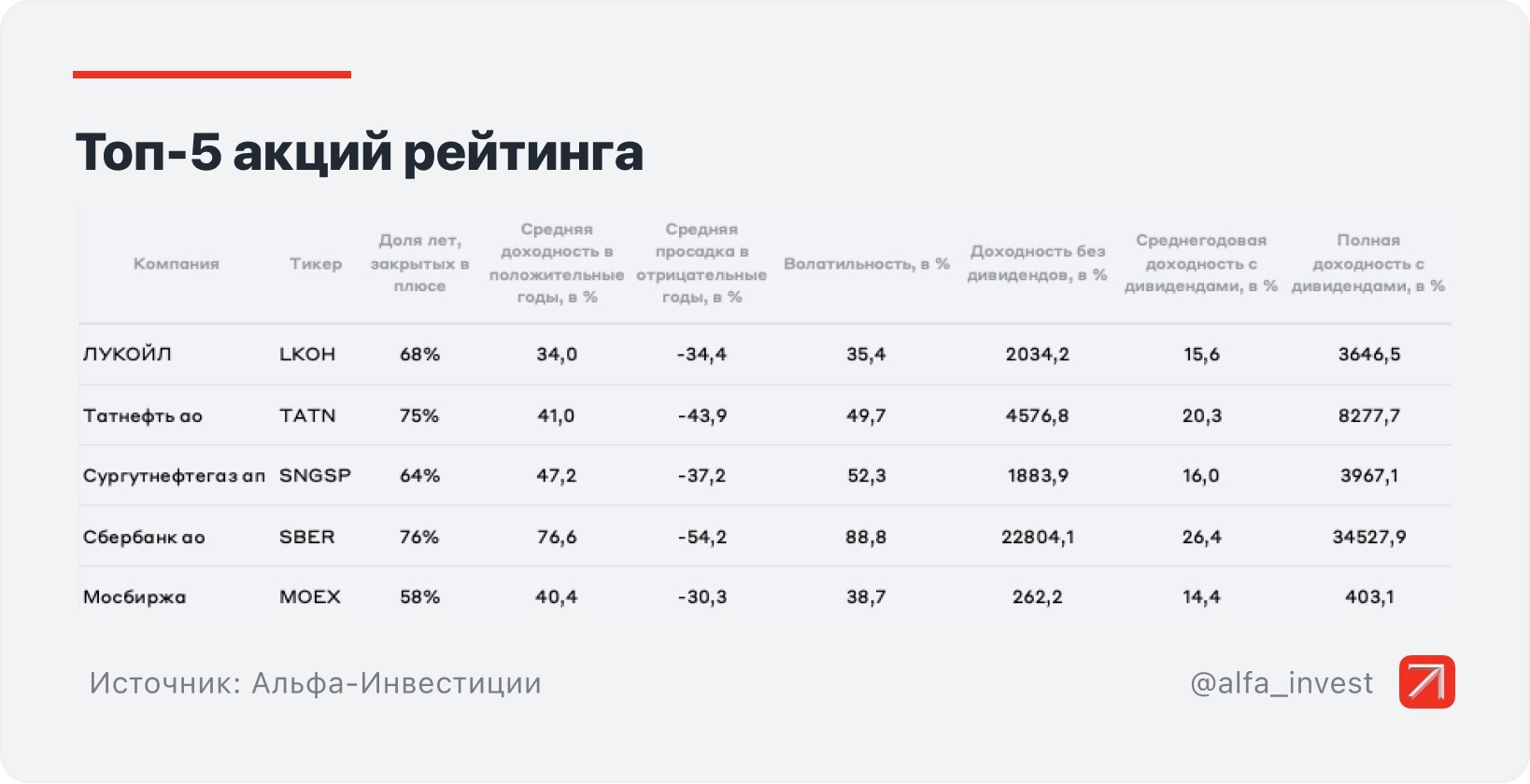 За каждый пункт начислялись баллы, которые потом суммировали — так получили лучших из лучших, чьи акции были наиболее доходными и стабильными. Вот эти компании, которые можно смело назвать чемпионами рынка: