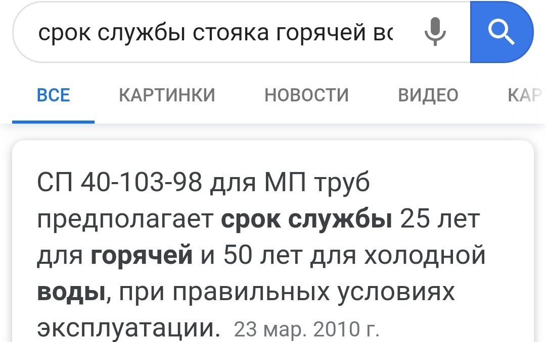 Потом закралась мысль "а схера ли так дёшево?". И тут я осознаю, что и у проводки, и у труб горячего/холодного водоснабжения, и у труб/радиаторов отопления есть свой срок службы. По ГОСТу? По закону? Не знаю даже и примерно в какой бумаге он задокументирован.