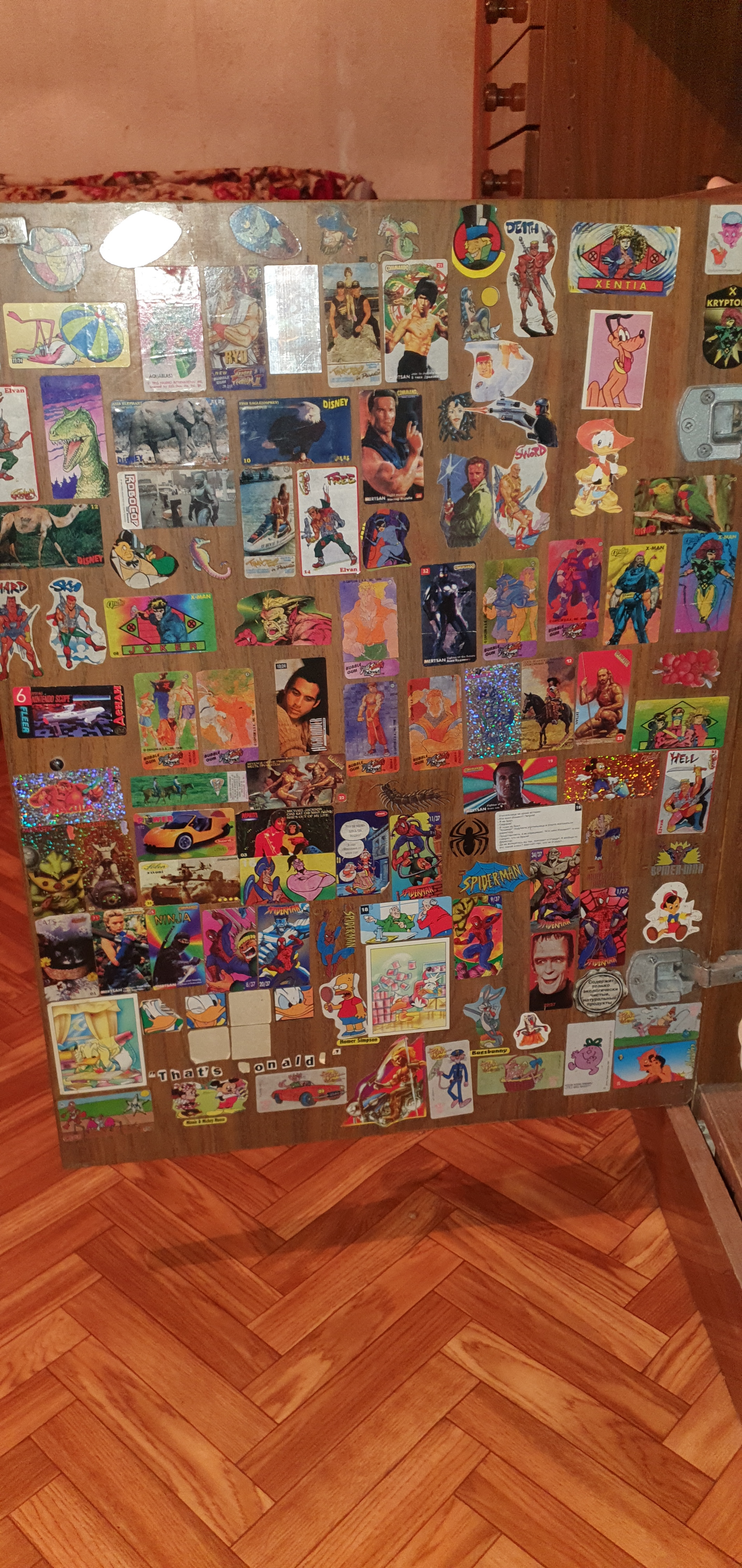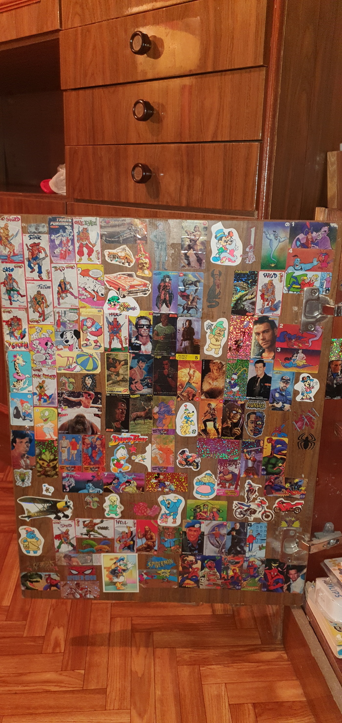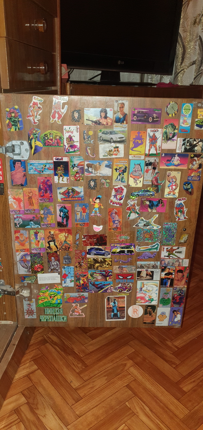 Читал на днях пост, то ли в горячем, то ли в свежем, где автор нашёл свой старый шкаф с отодранными от него наклейками, сожалел что не оставил их на память. Не так давно заезжал к родителям, решил проверить на месте ли наш с братьями раритет. Комнат у нас своих не было, зато был у каждого свой небольшой отсек в типичной советской стенке во всю стену, дверцу которого мы и обклеивали изнутри.