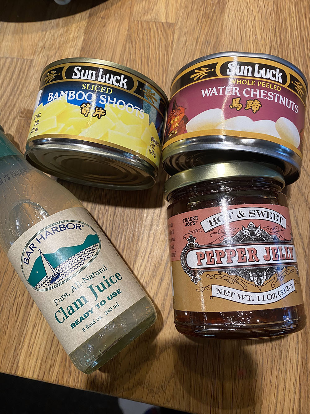 Из шкафа, по-моему не очень обычные. Тут сверху слева - бамбук, сверху справа - китайские водяные каштаны, хотя они вообще не каштаны, а клубни водяных растений каких-то, слева снизу - бульон из ракушек, снизу справа - сладкий джем из острых перцев. :-)