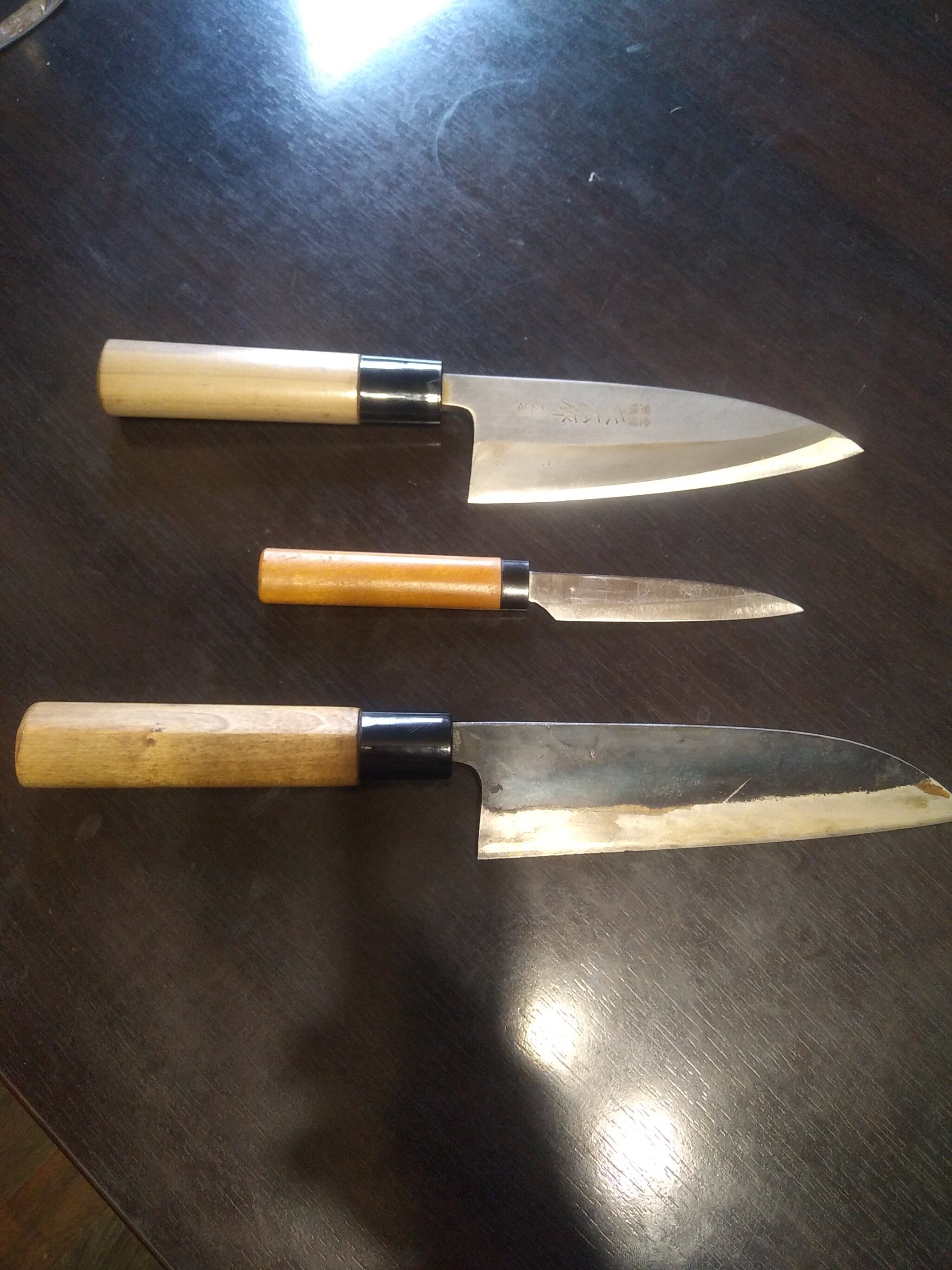 Такие рукояти можно делать на тех ножах, хват которых не является поварским. На японских ножах баланс находится далеко от рукояти. А сама рукоять выполняется с гранями. Грани нужны для контроля над клинком. Сама же рукоять чуть большего диаметра относительно маленьких японских ручек. Когда вы разделываете ножом с обухом под 5-8 мм океанского тунца, то поварской хват не нужен.