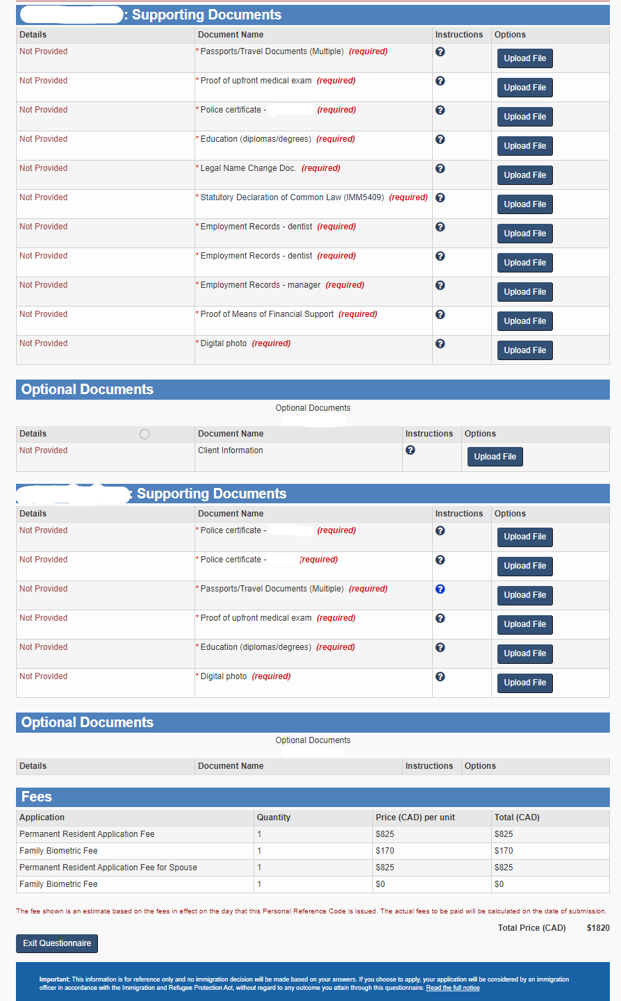 Этот документ (ITA – invitation to apply) означает что вы были выбраны из пула, можете оплатить процессинг (что-то около 1680 usd вроде как за двоих, я не помню) и начать заполнение анкеты. Она огромна и содержит много вопросов. Мы с моей сели заполнять в 8 вечера и закончили только большую часть к 2 часам ночи. Вопросы не сложные, но включают все места жительства за последние 10 лет (переезжали около 8 раз пока не купили квартиру) и все пересечения границ (брал справку местного аналога УФМС о выездах и въездах) за последние 10 лет. Много стандартных вопросов.