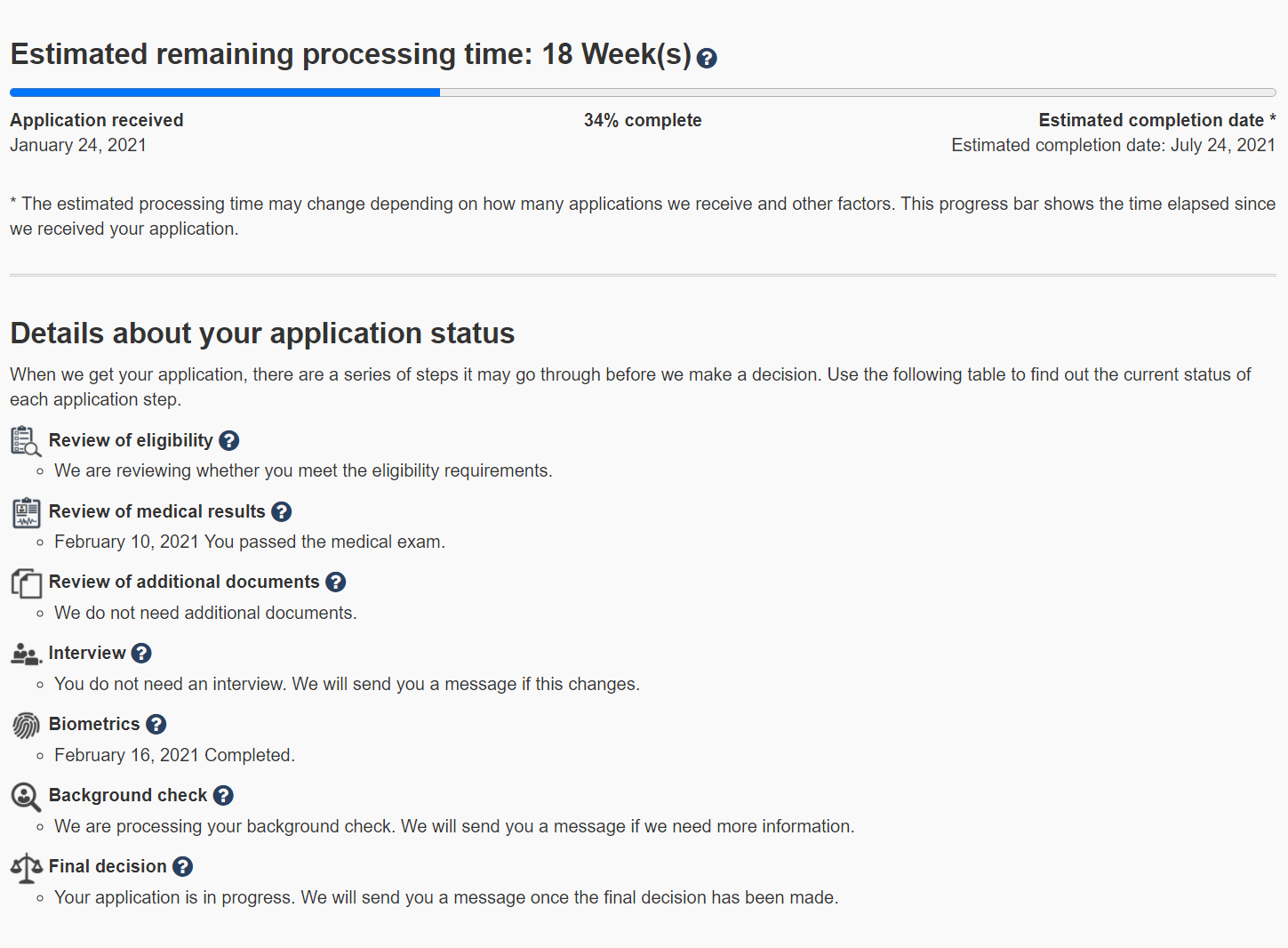Тут все весьма неопределенно - если у офицера возникают вопросы по вашим документам, то он/она затребуют дополнительную информацию или объяснение, которое вы вложите в letter of explanation (письмо с объяснениями которое подгружается в личном кабинете что бы его прочитал иммиграционный офицер). Если все окей, то будут просто процессить. Это занимает значительное время, у некоторых около 3-4 месяцев, у некоторых около года. Но в среднем заявленное время процессинга занимает 6 месяцев.