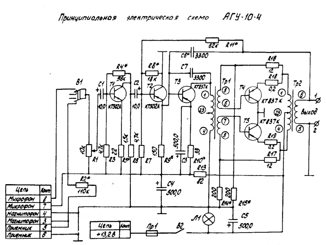 Ничего особо уникального в ней нет: селектор источника звука (микрофон/линейный вход), 3 каскада класса А (транзисторы Т1, Т2, Т3), и 4-й, выходной, каскад класса АБ (транзисторы Т4, Т5). Из необычного (для более современной техники) - только пара разделительных трансформаторов в цепи выходного каскада, эдакое наследие ламповой техники.