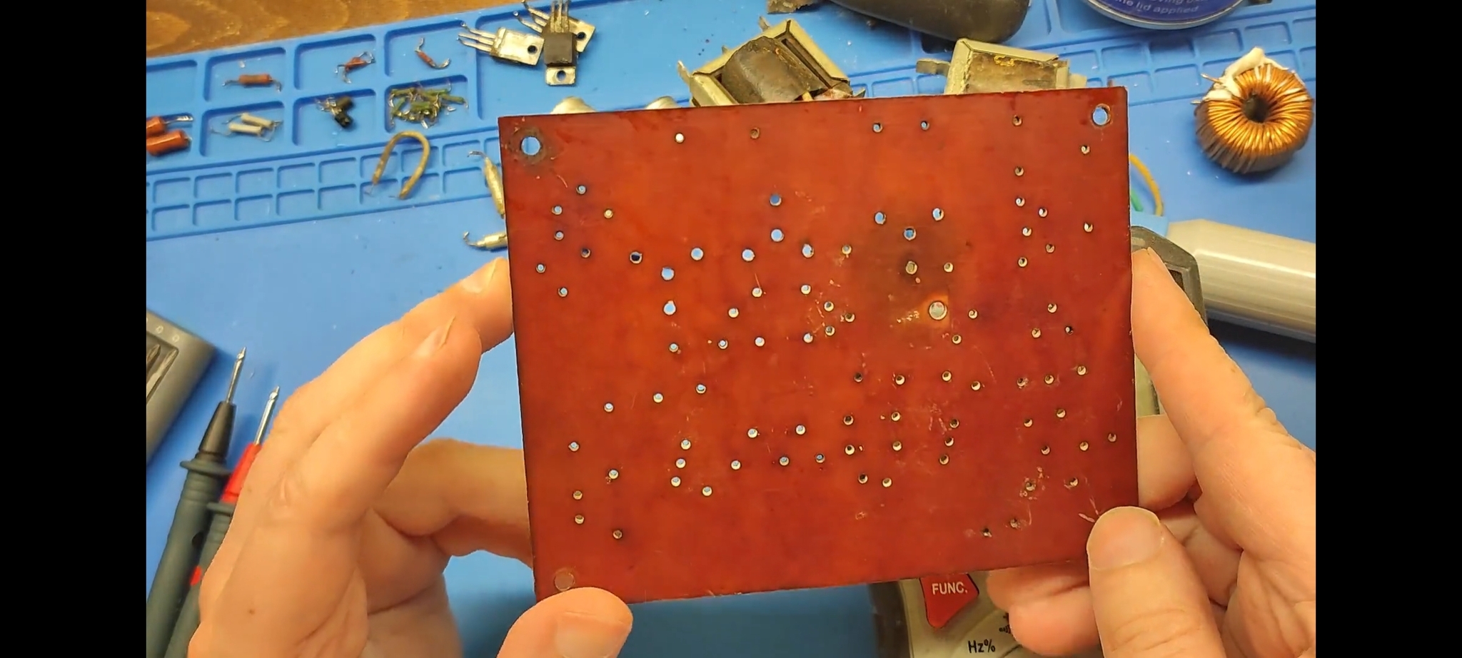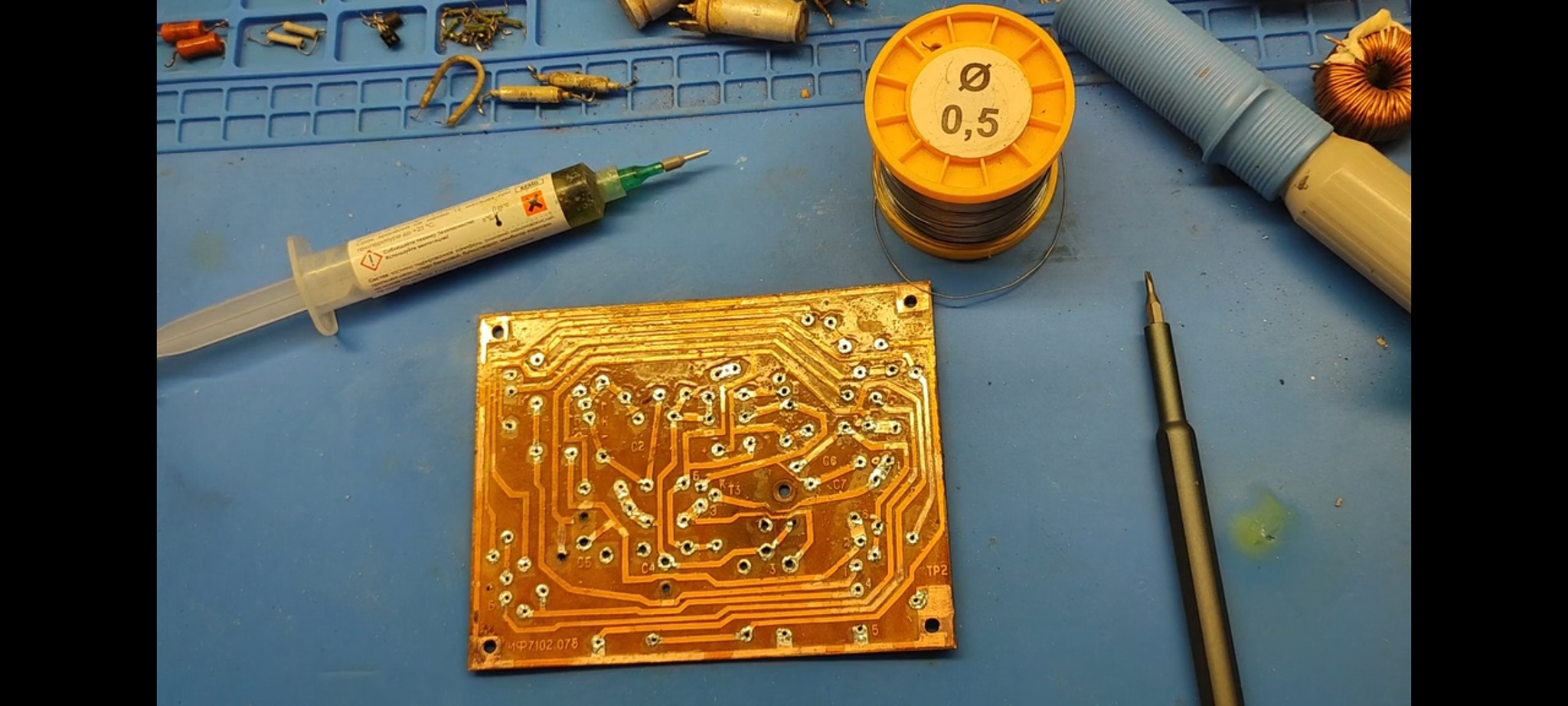 Восстановление начнём с того, что демонтируем все элементы с платы, отмоем её и зачистим окислы на медных дорожках: