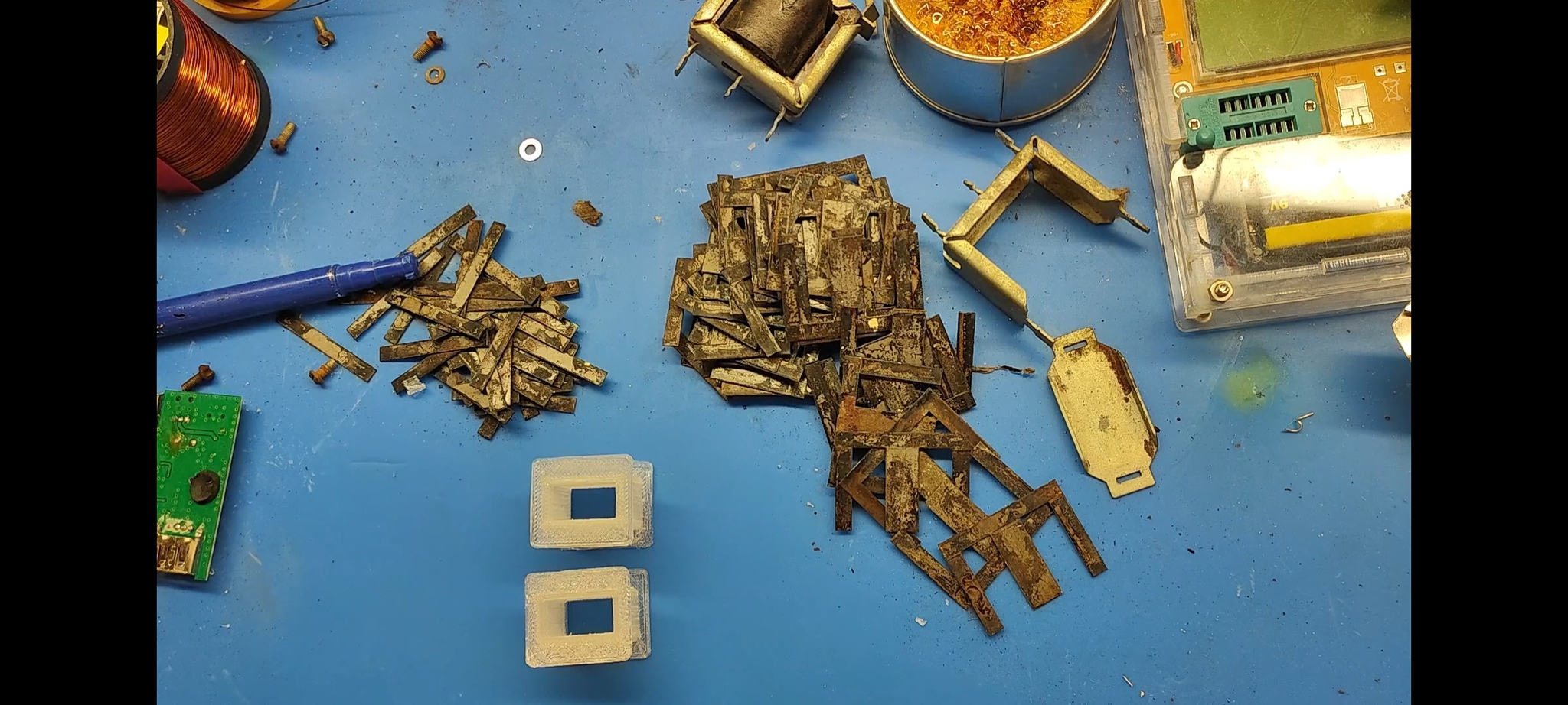 Теперь займёмся трансформаторами, ибо они тоже все сгнили. Разберём, зачистим и перелакируем заново все пластины сердечника, перемотаем обмотки на заново напечатанные на 3D принтере каркасы и соберём всё взад: