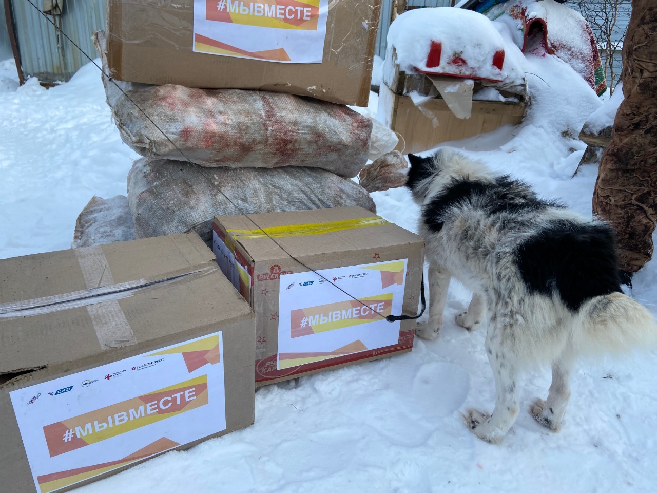 На этот раз собакам привезли 100 килограммов высушенных копыт, кадыков, желудков, легких и ушей, а еще три мешка свежемороженых субпродуктов из северных домашних оленей. Звучит, может быть, не очень аппетитно, но для животных это настоящие деликатесы и лакомство! Причем никакой химии, весь корм натуральный, произведен из экологически чистого и уникального по своим свойствам сырья.