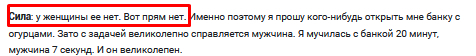 Сила: у женщины ее нет. Вот прям нет. Именно поэтому я прошу кого-нибудь открыть мне банку с огурцами. Зато с задачей великолепно справляется мужчина. Я мучилась с банкой 20 минут, мужчина 7 секунд. И он великолепен.