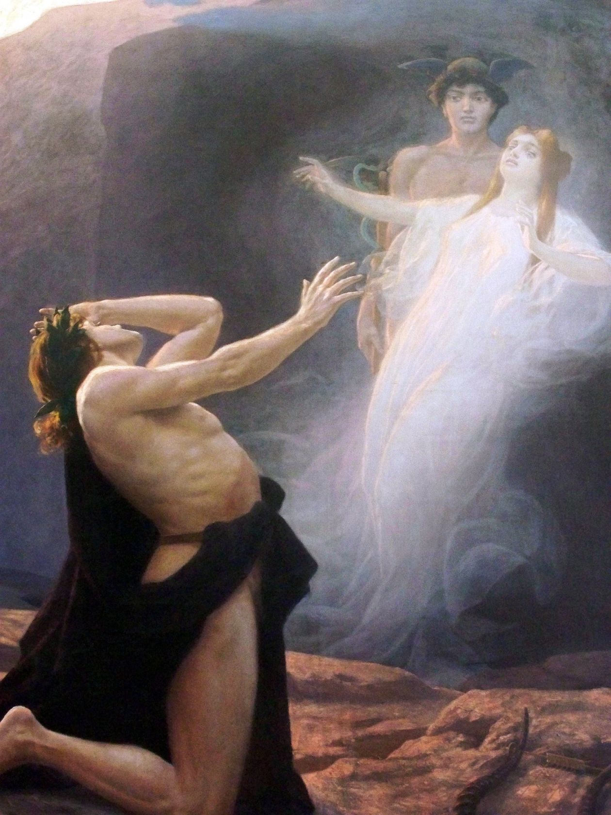 Тут надо сказать, что у этой истории, как у всякого древнего мифа, есть множество вариантов. То ли Орфею стало казаться, что он возвращается один, никого за собой не ведёт – и неудивительно, ведь тень Эвридики бестелесна! То ли Эвридика стала жаловаться, что Орфей разлюбил её, раз на неё не смотрит, и сердце Орфея не выдержало, и он оглянулся…