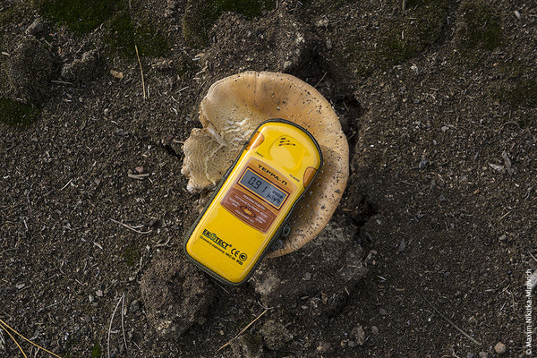 Ради интереса кладу дозиметр на один из грибов, что растут в низинке неподалеку. В низинку стекают сточные воды, здесь много мха, и грибы должны прилично фонить. И точно — вот эта сыроежка "светит" около сотни, скорее всего это цезий-137 и стронций-90. Если такую скушать — то радионуклиды могут остаться в организме и создать за пару лет весьма серьезные проблемы. Вот почему я в целом не рекомендую собирать грибы в Беларуси и в северных частях Украины — они как губка втягивают всю грязь. Особенно моховики, рыжики, польские боровики и маслята. Самая радиоактивная дрянь.