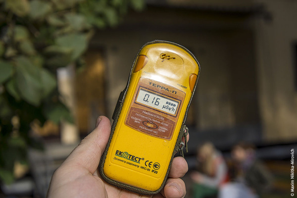 Замеры в Киеве, центр города в районе железнодорожного вокзала. 16 мкр/час. Черный дозиметр только включили, поэтому он пока показывает "ноль"