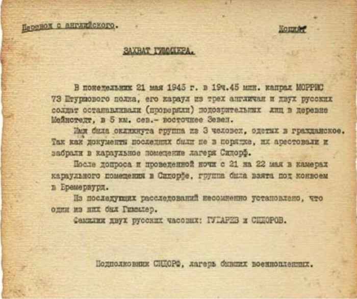 И кстати советские солдаты ревностно и добросовестно относились к своим обязанностям. Вечером 21 мая британские солдаты, попив кофейку завалились спать, а Губарев и Сидоров отправились на патрулирование. Они и заметили, как из кустов вышли крадучись три немца. Губарев приказал им остановится, но те не послушались. Дав предупредительный выстрел, солдаты взяли немцев на прицел. Задержанные предъявили документы и объяснили, что больны и идут в госпиталь. Внешне вроде все было в порядке, но солдат проведших четыре года в плену и знакомых в особенностях немецкой формы насторожил факт, что на рядовых солдатах были офицерские плащи. Кроме того один из задержанных (Гиммлер) был одет в гражданские брюки, а на голове ... штатская шляпа. Для дисциплинированных немецких солдат, даже после капитуляции, такое нарушение формы было немыслимым. «Солдат» доставили к британцам, те ничего подозрительного не обнаружили и хотели их отпустить. Но Губарев с Сидоровым настояли, чтобы задержанных отконвоировали в сборный лагерь для более тщательной проверки. Смутили их беленькие ручки и холеные морды «простых солдат». Таких у фронтовиков не бывают. Не бывает у них аккуратно наманикюренных пальчиков. Ногти у них закорузглые, с намертво въевшейся грязью. И пахнут они не одеколоном, а порохом, гарью, вонючими лазаретами и дерьмом окопов.